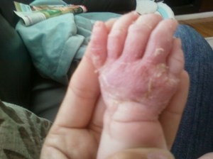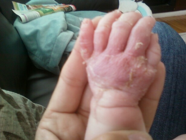 Kaili got her bandages off today, hooray! Her hand looks funny and a bit swollen. Some of the skin is peeling off but over all the scaring on her hand should be minimal if at all.