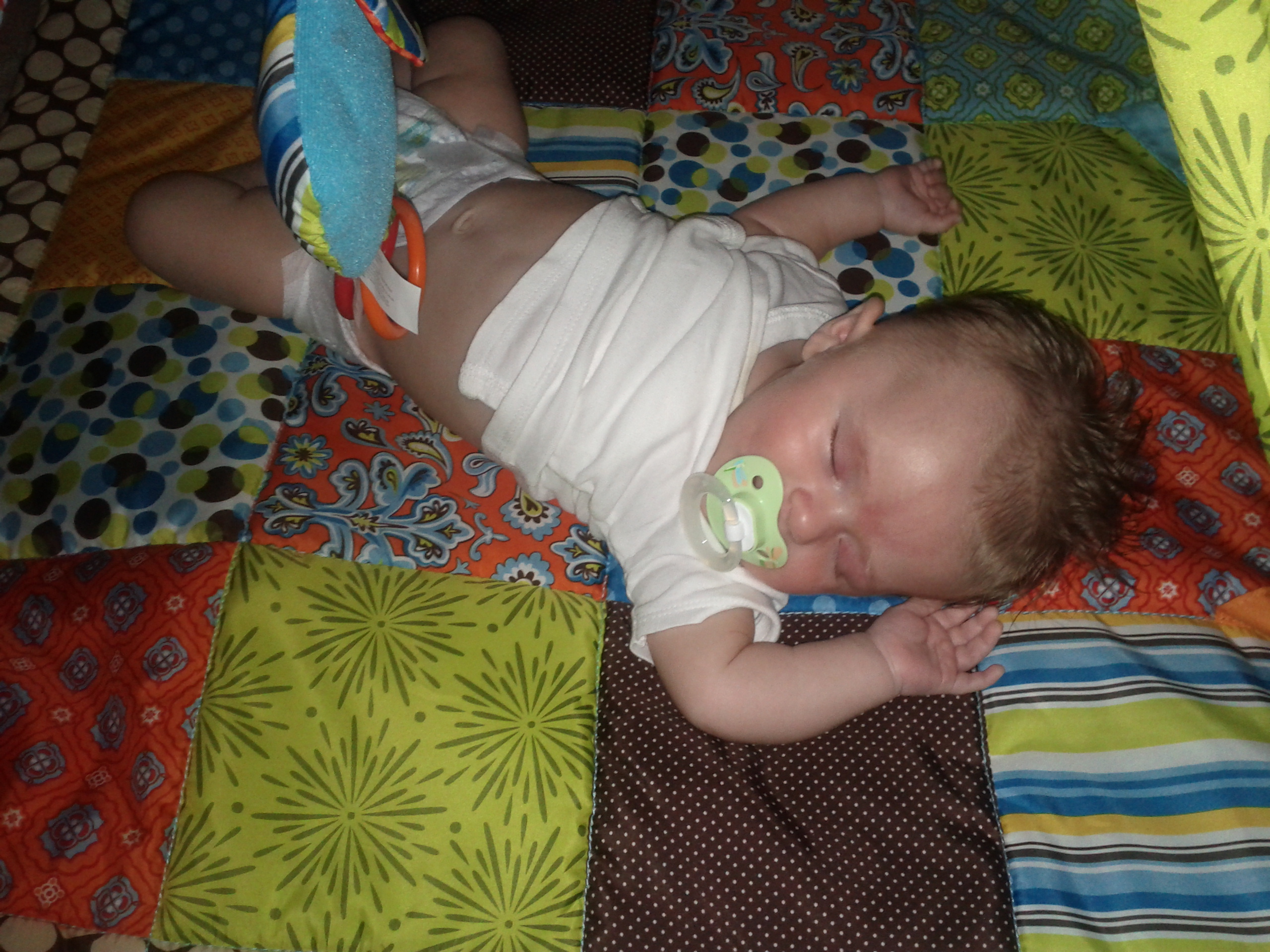 Now that Kaili will hang out on her play mat on and off during the day, it really wears her out. She bats at the toys, moves her arms and legs and it must be good exercise. I know this because this is what I found after about 1 hour of playtime.