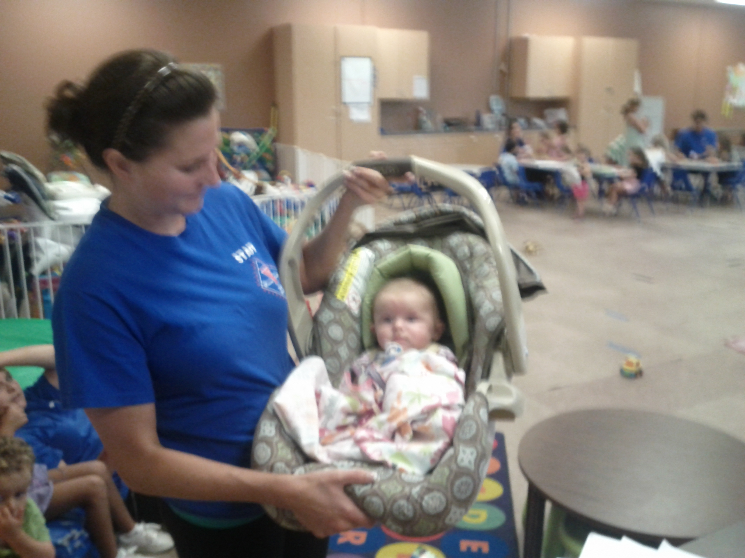 Sure it was only an hour and a half but it was the first time I have left Kaili with someone other than family. Today I took Kaili to the YMCA Kids Club while I got some exercise. They take kids 3 months and up but the “infant” area is sectioned off and the ratio is 1:6. When I arrived there were already 5 babies so luckily Kaili got the last spot, I can see that being an issue in the future. I was a little nervous walking away from dropping her off but I quickly let it go once in class. An hour and a half later when I went to get her, the club was a zoo. Kids were screaming, cying and I noticed there were some kids much older than infants in the baby area. No, I didn’t complain because I plan on going back…a lot! However, like I said before they only take 6 infants at a time so if I get there and they are full I am out of luck. I either wait or we go to plan B.
