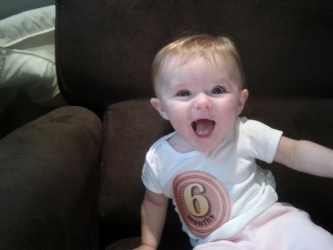 On the flip side she has finally found her laugh and I don’t think there is anything cuter than her little giggle. She is ticklish, especially above the knees just like me. She also gets a kick out of a game of peek a boo with a blanket and likes to be scared..BOO! Go figure.