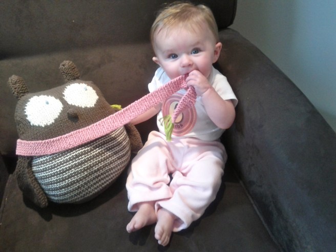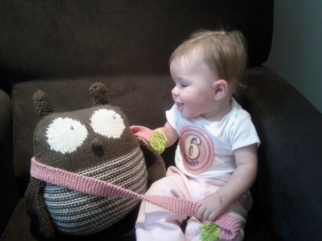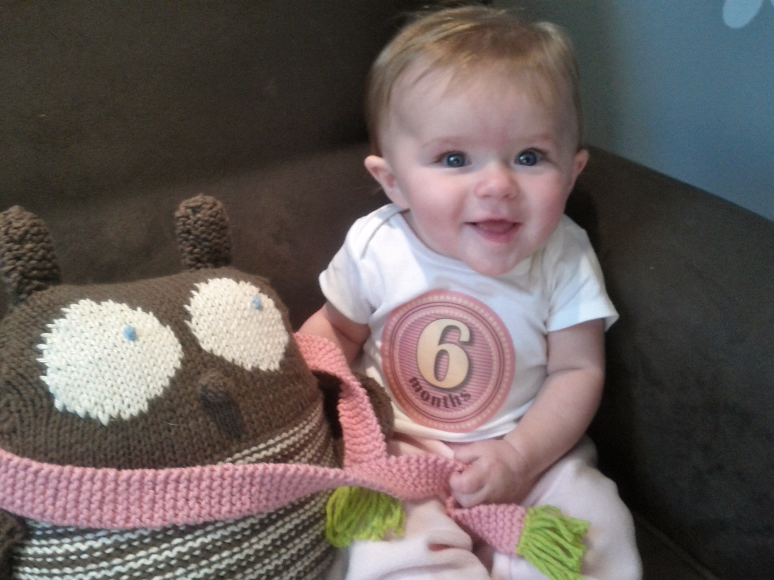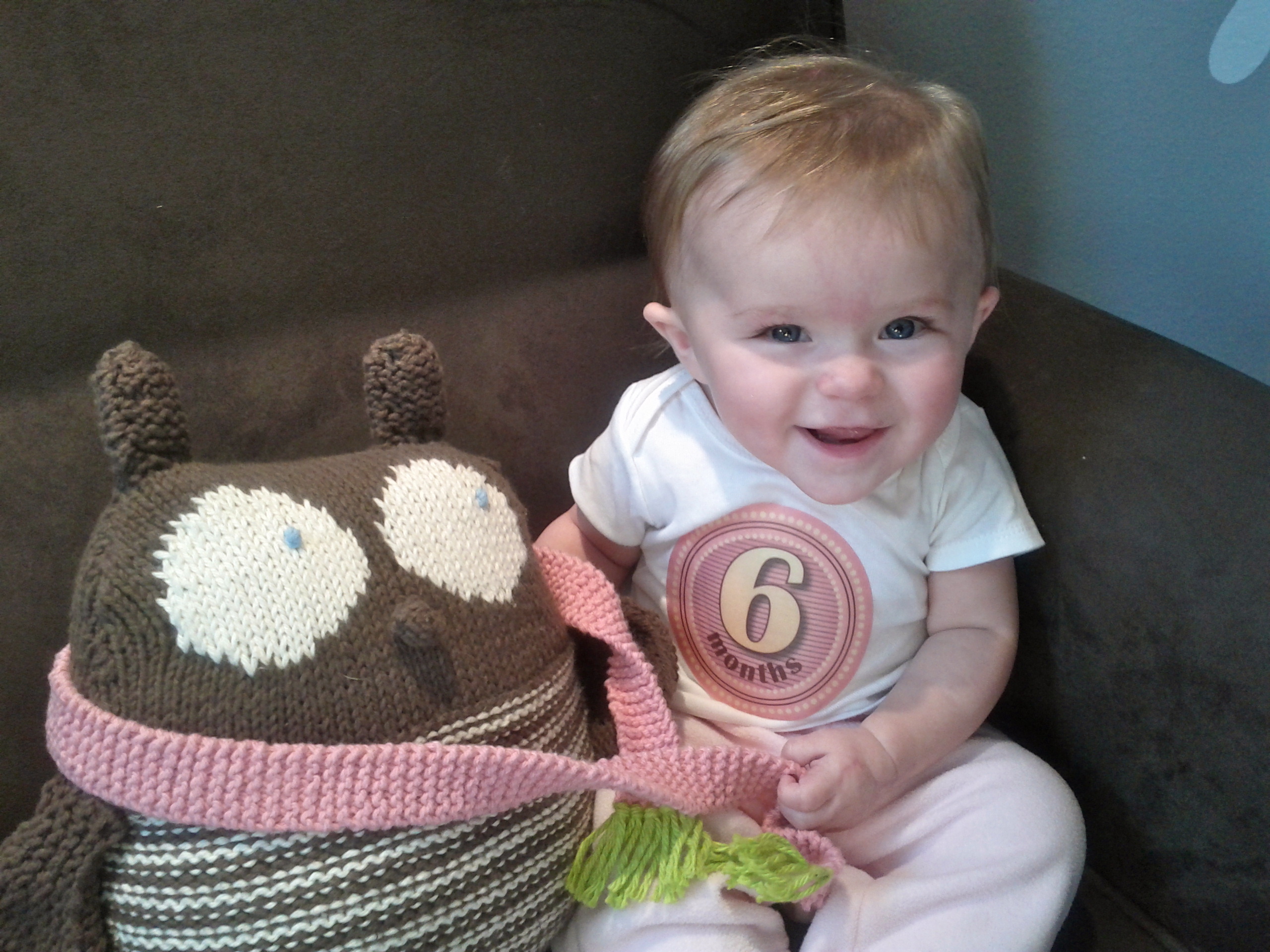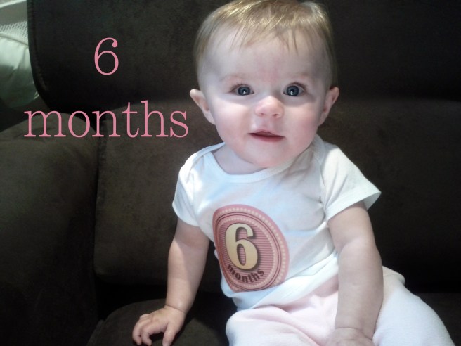 The last few weeks we have seen some changes in her, just more proof that she won’t be a baby forever. Kaili has gotten her two bottom teeth and it seems that her 4 canine teeth will make an appearance in the near future.This turned our good sleeper into a non-existent one for a week or so. She was waking up every hour and sometimes not going back to sleep until a few hours later. It seems the worst is over (for now) Tylenol at night seems to be helping and she has been sleeping pretty well the last few nights. She is also done with the swaddle so the big girl is in footed PJ’s and sleeping on her side and stomach most of the time. I will admit it still scares me a bit and I find myself checking on her during the night but that’s the way she is comfortable and since she is 6 months the risk of SIDS has gone down greatly. She has been putting herself to sleep for the most part and sleeps with a cat “lovey” that she will use as a pillow, we have ourselves a smart one here!