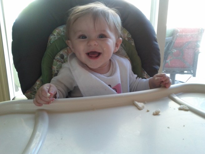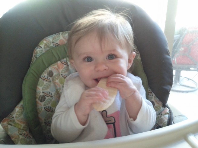Since Kaili’s last cold her interest in pureed foods has diminished. I guess it’s time to introduce finger foods. Her fine motor skills are still developing and she can’t quite pick up small pieces of veg or fruits yet but she can feed herself baby Mum Mums.