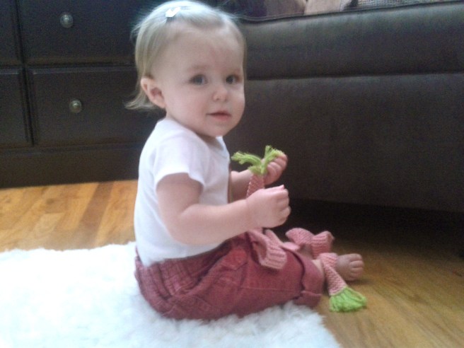 Friday we had her baby well checkup plus a couple vaccinations she was behind on. She took them like a champ {as always} with just a few tears, I admire her strength. Dr. Hansen said all is well. Her head is still in the 90th percentile with her body slowly catching up. She weighs 15 lbs. and is 25 inches long. He told us to get rid of the bottles and to start her on sippy cups pronto. Now I get the task of finding the perfect cup and try to figure out how I want to make the transition, cold turkey or slow and steady.