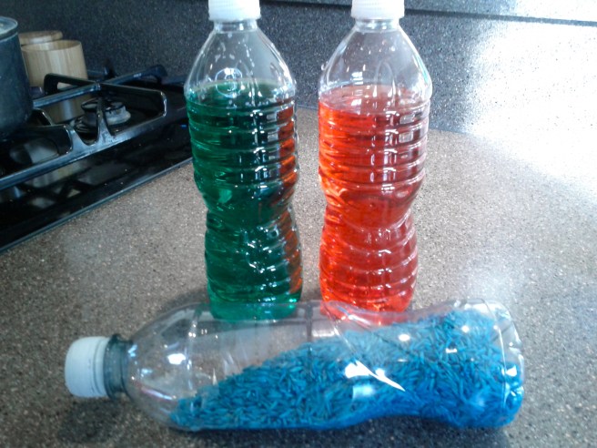 I started with just a few since I only had 3 empty water bottles. I made two with colored water and one with colored rice.