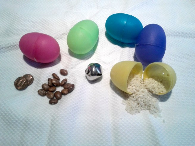 These shakers can be used for many different things and all ages. For babies they are great for sound development and fine motor skills. For toddler and preschool ages they can be used for music and teaching sound discrimination. In the classroom I would bring these out at Easter time. I would fill eggs with different items {2 eggs had the same item for matching} then I would hide them around the room. The children would take turns “hunting them” and then they had to match the eggs with the same sound. They always enjoyed this lesson and it was great watching the all the other kids try to help. It was a great way to teach sound matching, patience and taking turns.