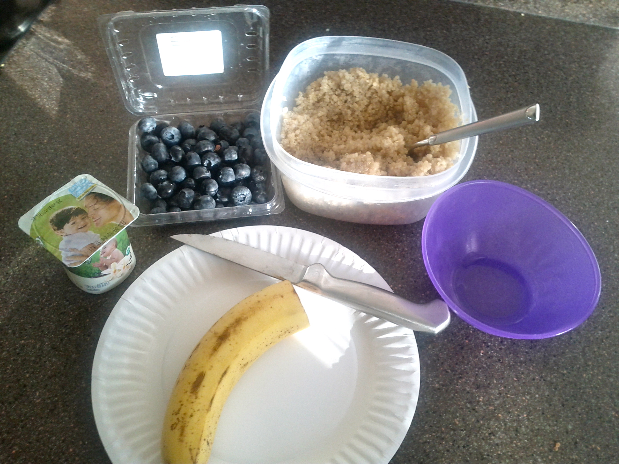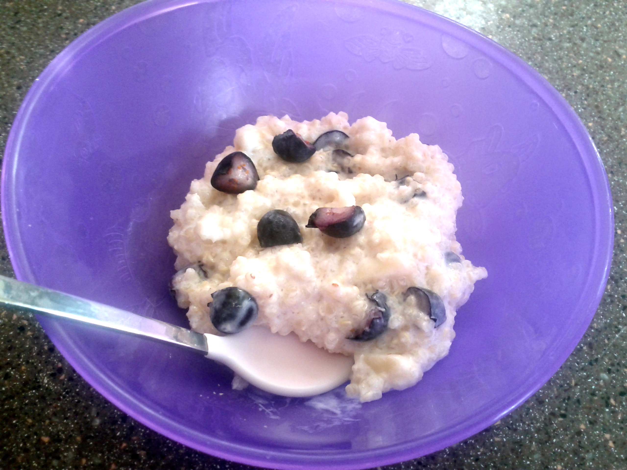 Quinoa is a staple in our home, I will use it in place of rice or couscous and it makes a mean tabbouleh. I came across a few good quinoa recipes for baby on this site. This particular one looked pretty yummy plus I had the ingredients on hand. I also had blueberries in the fridge {which Kaili loves} so I decided to throw those in too.
