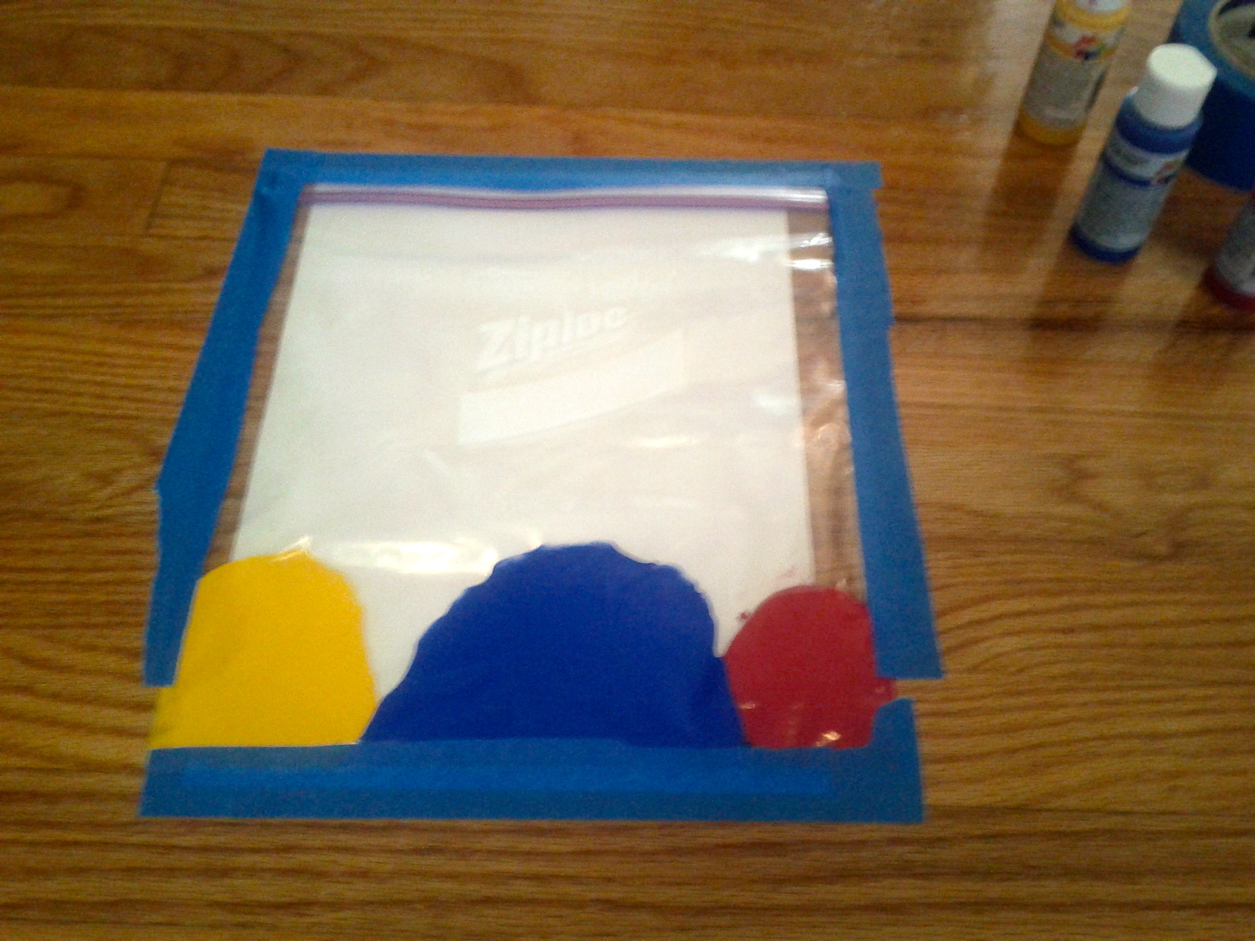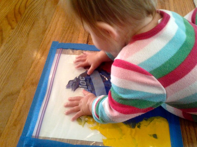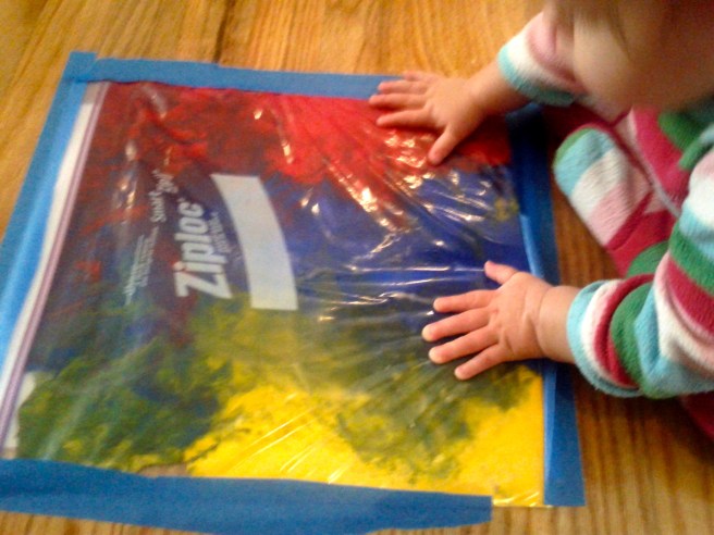 I thought this would be a perfect way to let Kaili paint without the mess or the worry about her eating the paint. So I put some paint in a ziplock bag and taped it to the floor with a piece of white construction paper underneath it and let her at it.