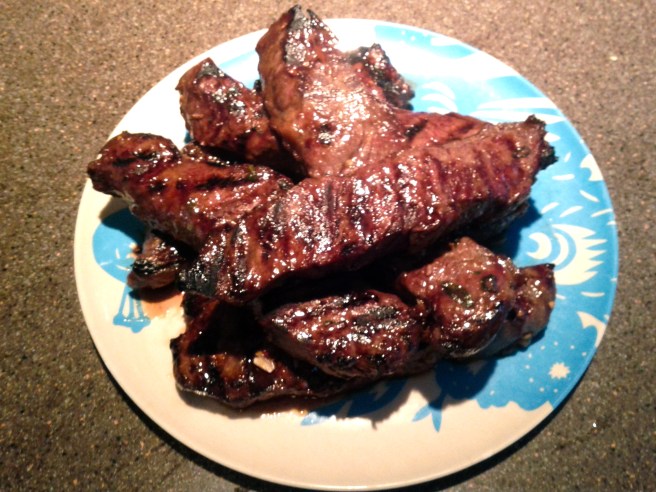 I bought some boneless beef short ribs at our last run to Costco and was trying to decide whether to braise them with red wine or marinate them Korean style. I chose the latter and they were so very good. This recipe is combination of this recipe and this recipe. I also added some Hoisin sauce because everything is better with Hoisin sauce. Both recipes said to grill the ribs for 3 minutes a side but I found that it was more like 5 minutes for rare. Maybe my grill isn’t as hot as it should be, who knows.
