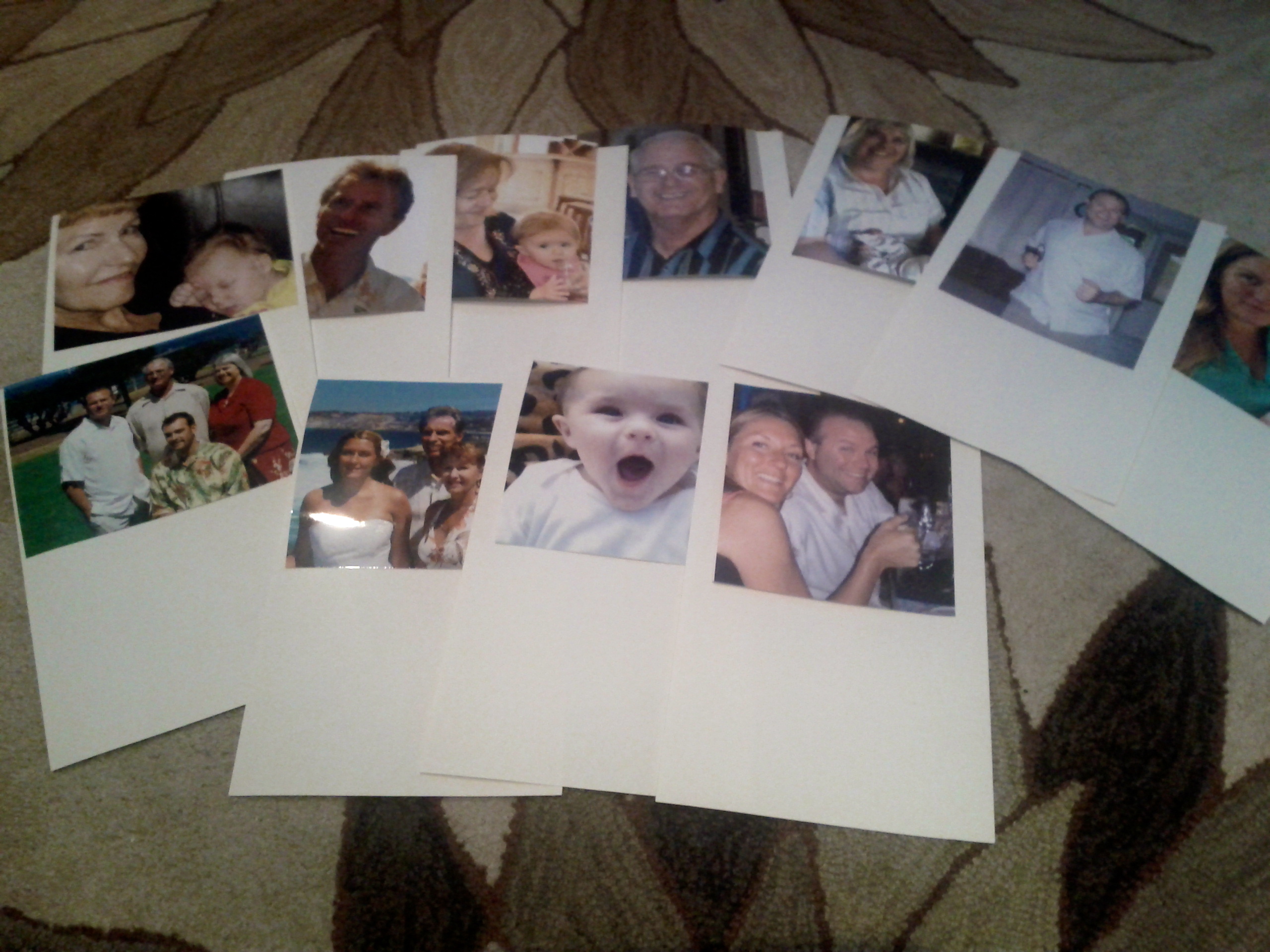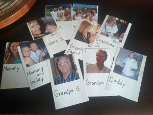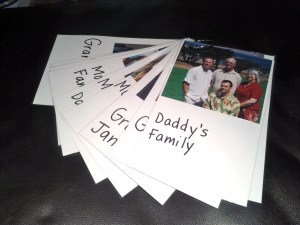 Shane and I are so thankful for our parents and my Aunt for their generosity. They will be watching Kaili while we are gone and taking her to London without us. I am a little worried about how the transitions will go from one caretaker to the next. Kaili doesn’t get to see Shane’s folks often and that could make for a little separation anxiety on her part. I decided to make some family photo cards to help her learn who is in our family. I figure if I start showing them to her now, it will be a lot easier when the time comes.{fingers crossed}