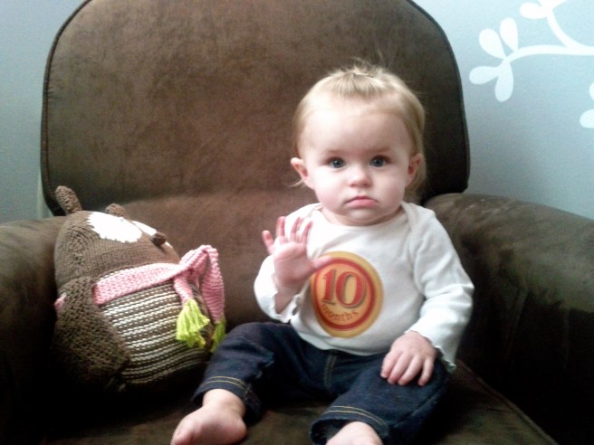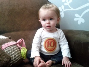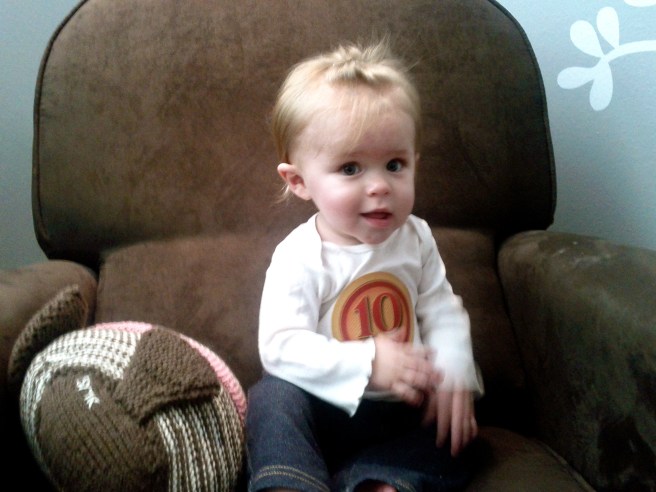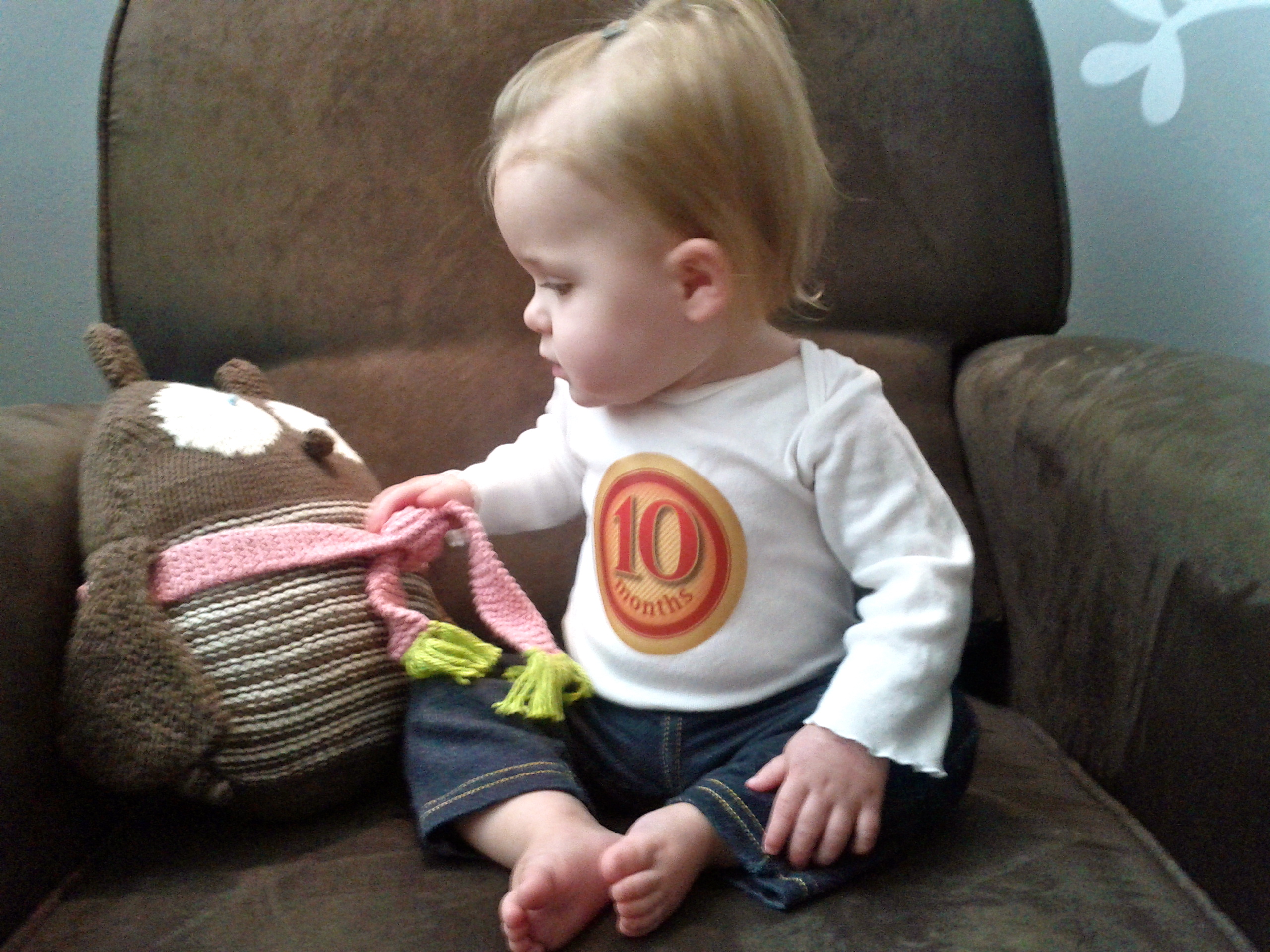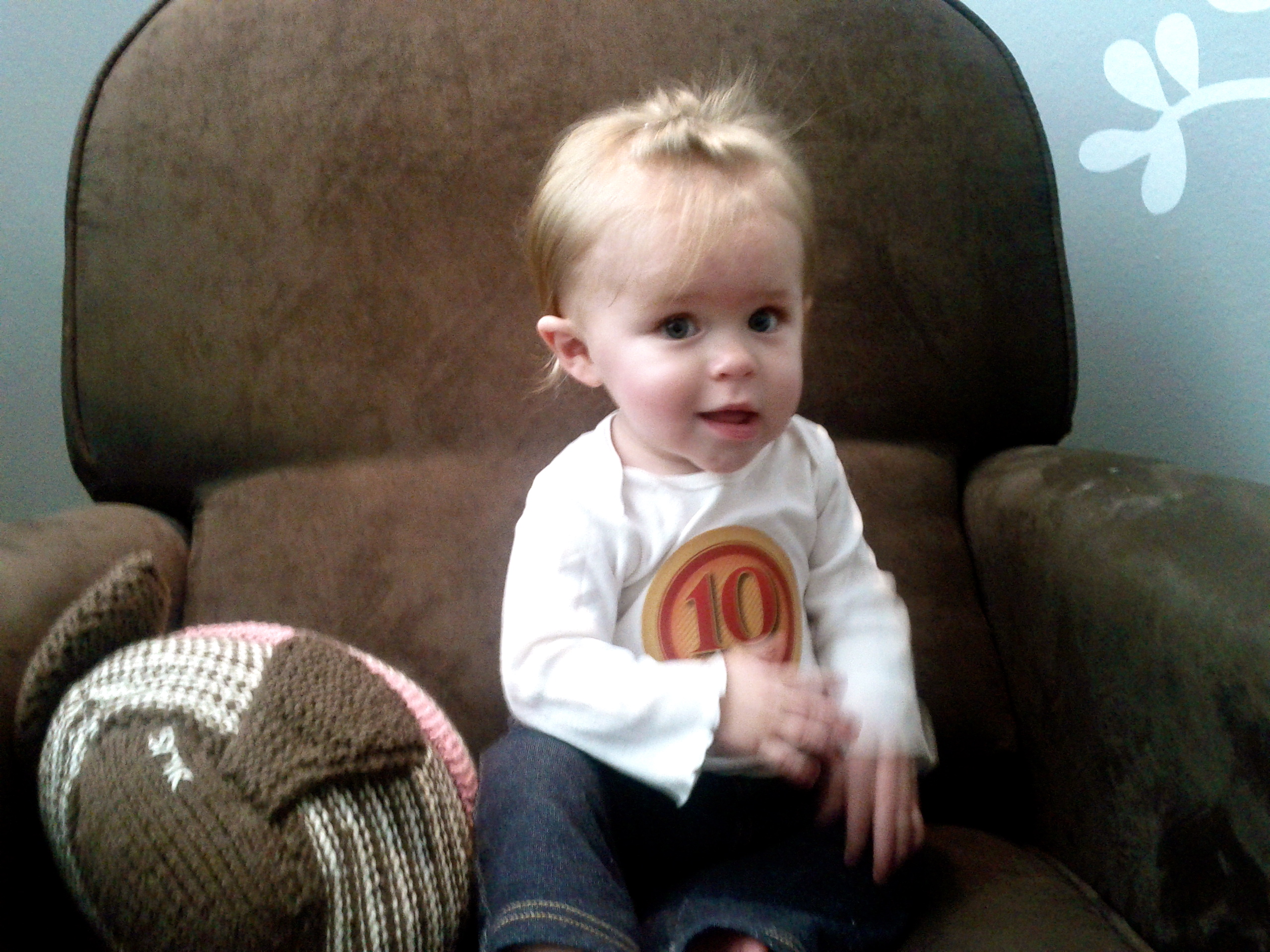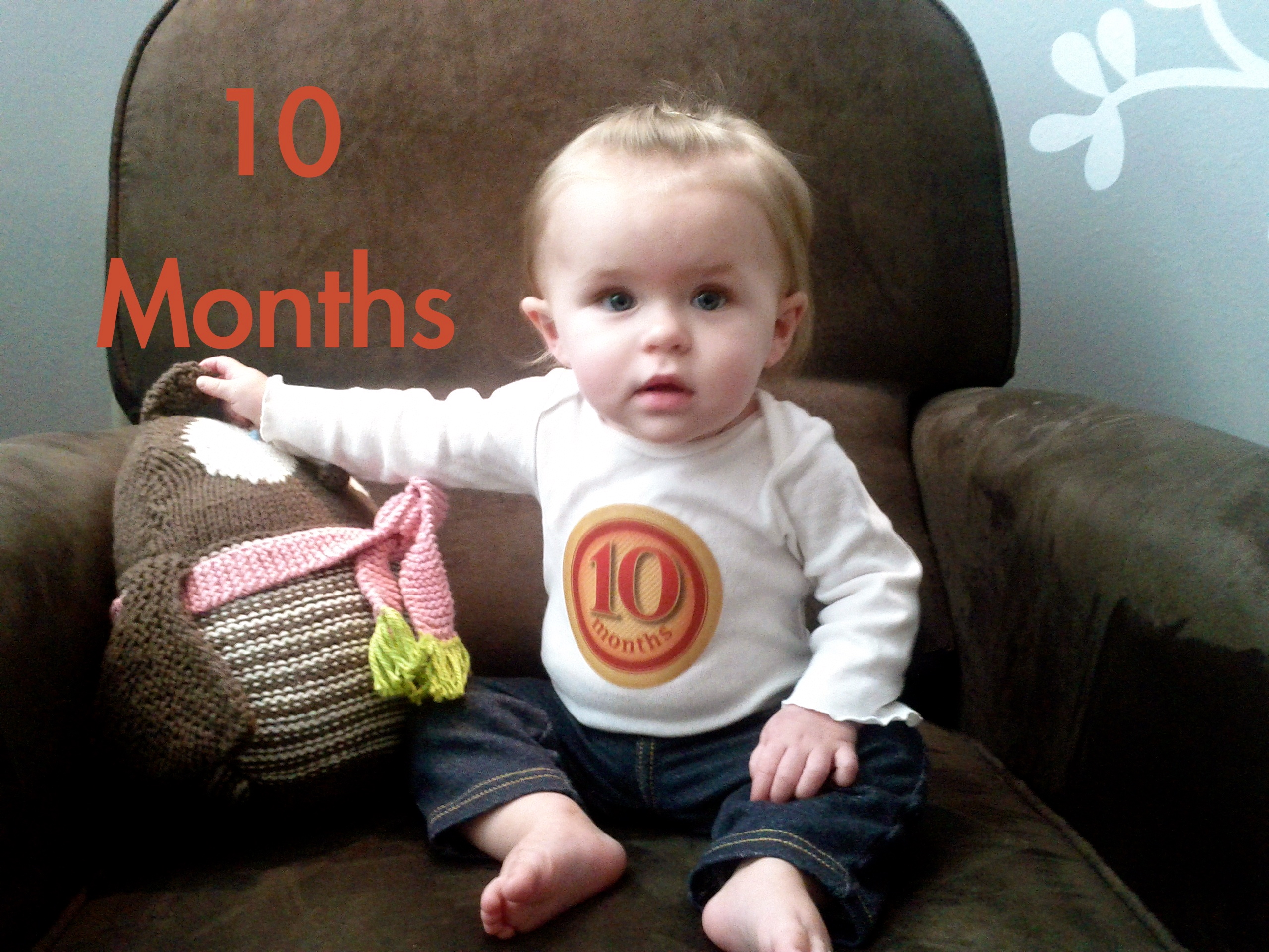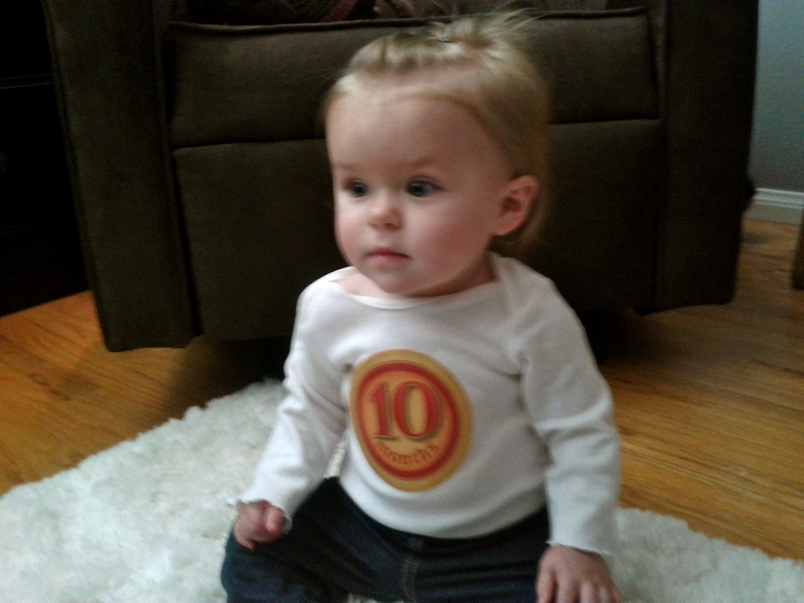 10 months old, what a great age. Kaili went from slowly starting to crawl to cruising around in a matter of a week, she has gotten fast! She loves to pull herself up on anything she can grab ahold of and likes to cruise the furniture.