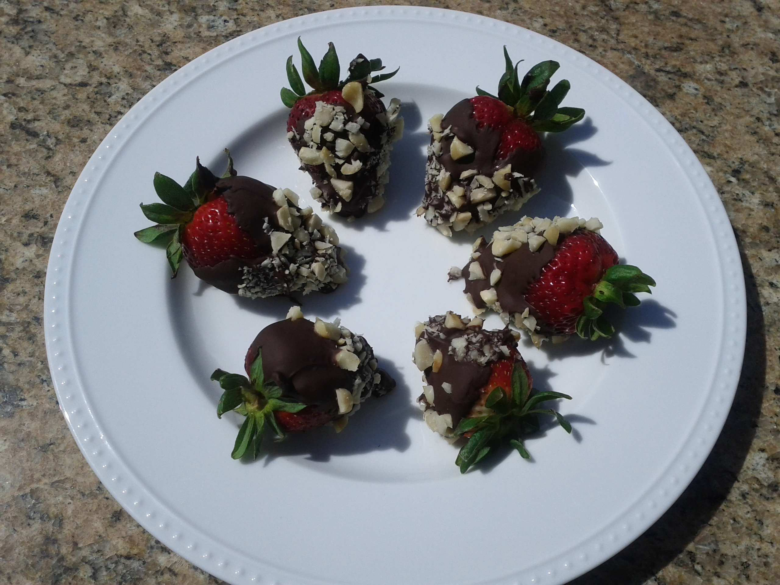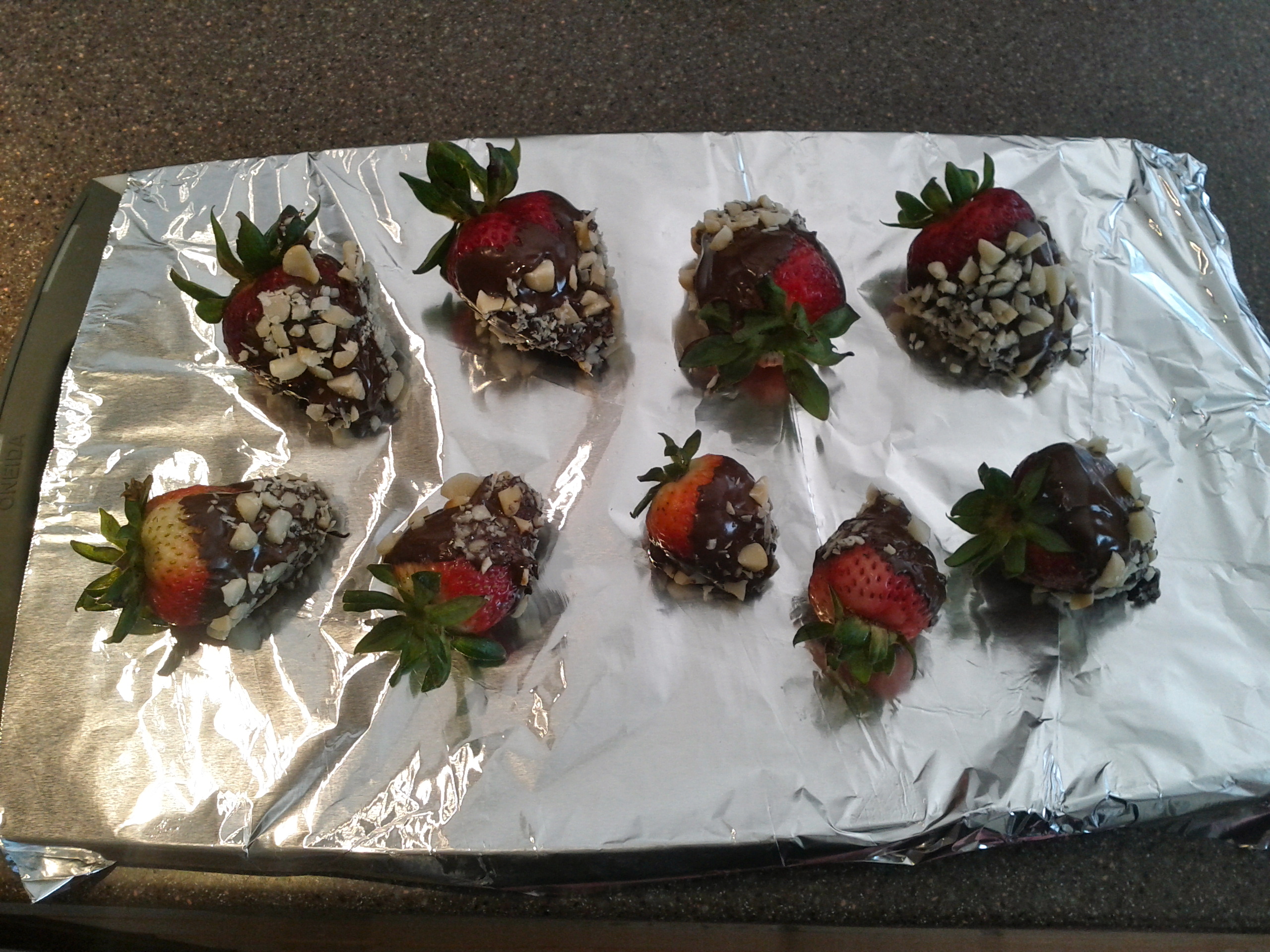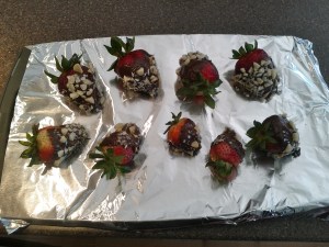 Alright, now that I cleared that up, grab some strawberries and wash them while leaving the stem on. Dip them in the melted chocolate and roll them in chopped macadamia nuts. You can use roasted salted, roasted unsalted or whatever your heart desires.