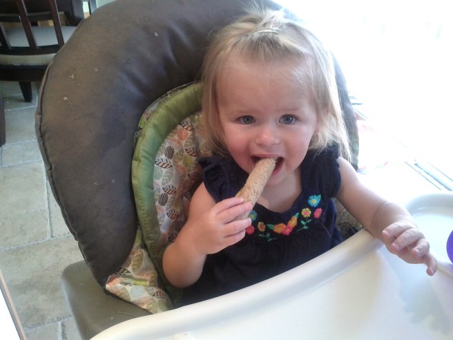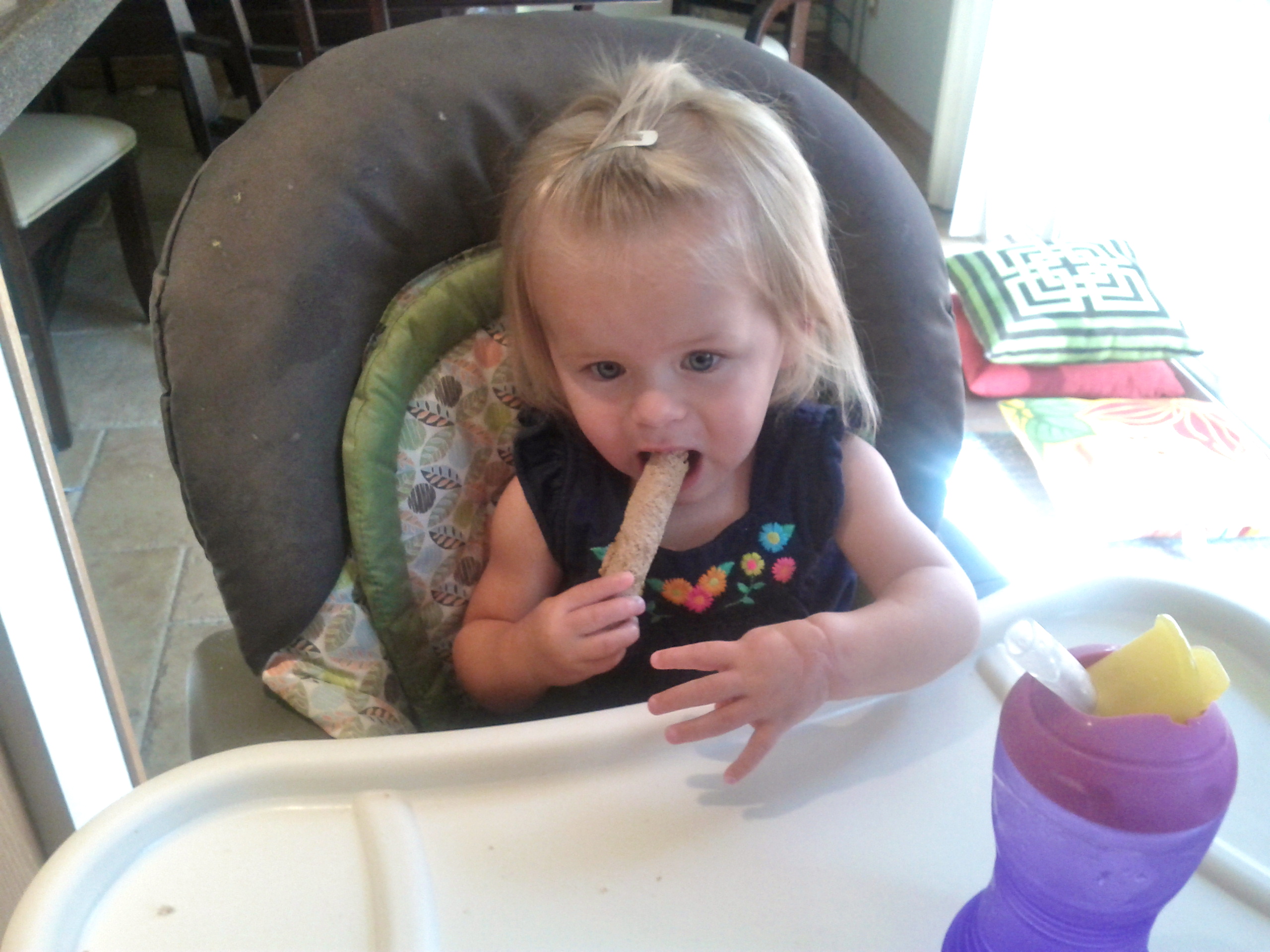 Kaili gnawed on that thing for a good 15 minutes. Once she was over it, I put it in the fridge until I saw her hand go into her mouth, then I gave it to her again. Such a great idea, easy to make and much cheaper than buying a box of those Earth Organic teething biscuits.
