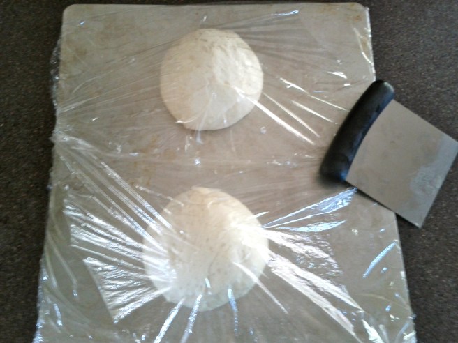 One hour before baking pizza, adjust oven rack to second highest position (rack should be about 4 to 5 inches below broiler), set pizza stone on rack, and heat oven to 500 degrees. Remove dough from refrigerator and divide in half. Shape each half into smooth, tight ball. Place on lightly oiled baking sheet, spacing them at least 3 inches apart; cover loosely with plastic wrap coated with nonstick cooking spray; let stand for 1 hour before topping and baking.