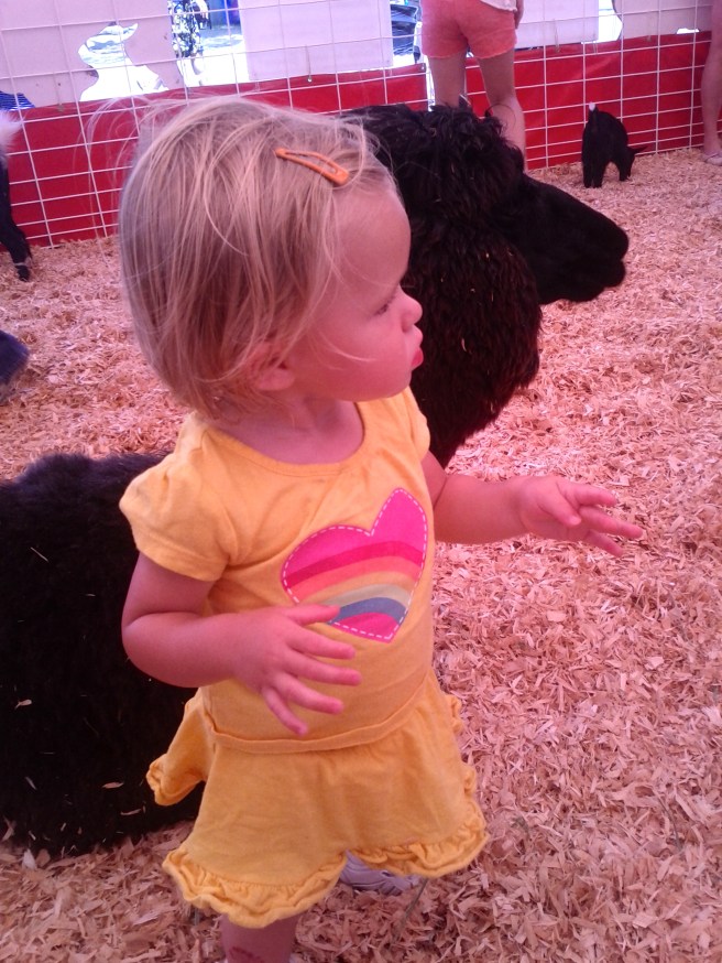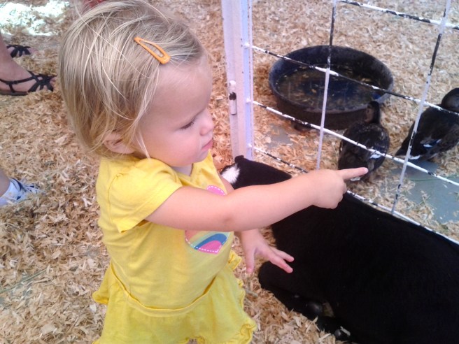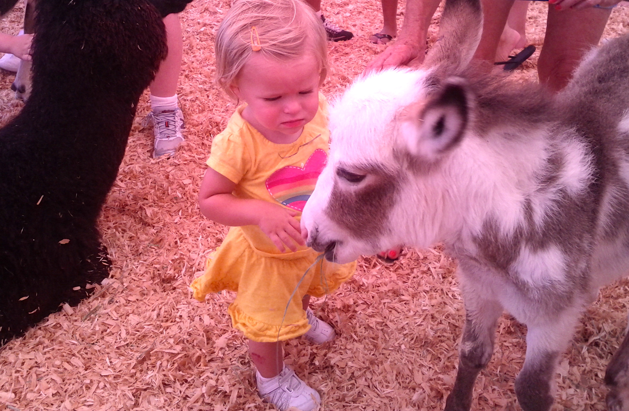 As soon as we got through the entrance we hit the petting zoo. Goats, pigs, Llamas, miniature donkeys and 90 degree weather, who wouldn’t love it? Kaili was a little timid and not terribly sure about being left on the ground with these “gigantic” animals. At first she was enjoying a real life animal adventure.