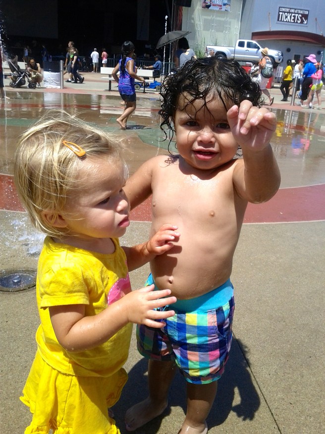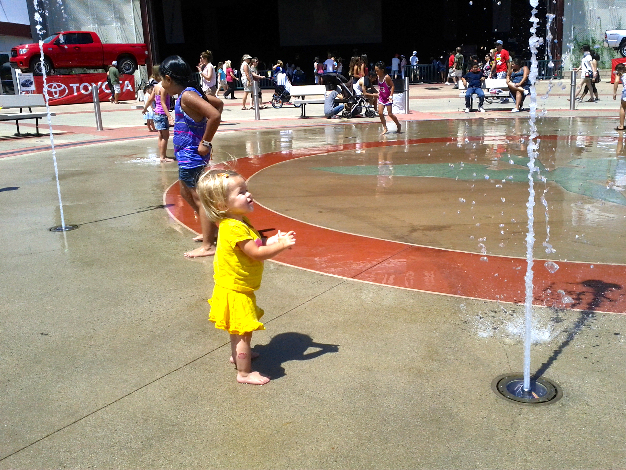 After a lunch of corn dogs and gyros we let Kaili play with the water area. She approached it with caution but then went full force getting completely soaked. She also met a little friend, she seemed to think this little boys nipple was a button, just kept pushing it. How embarrassing.