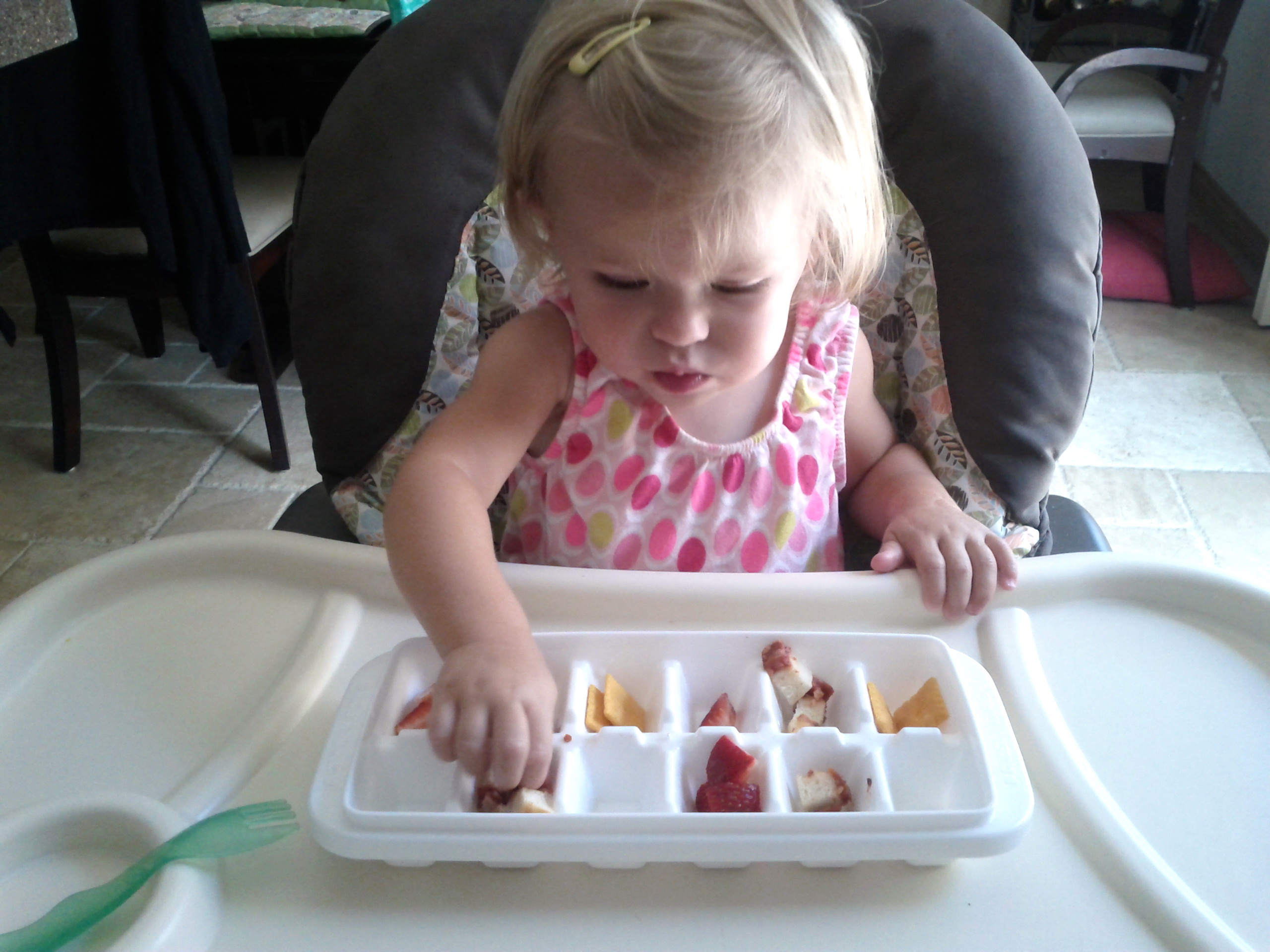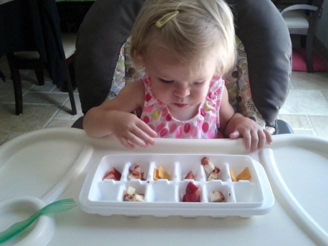 Kaili’s appetite is hit or miss these days. She also doesn’t do well with leftovers but who can blame her on that? Eating the same thing meal after meal is plain boring. I remembered something I saw on Pinterest and gave it a shot. I put a variety of cut up food in an ice cube tray and let her have at it.
