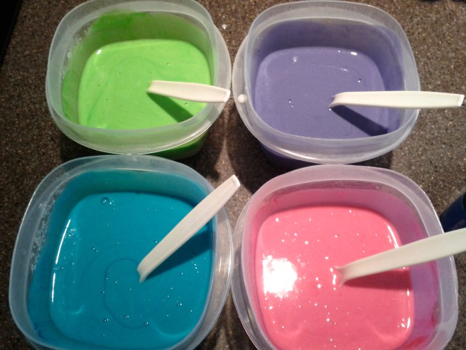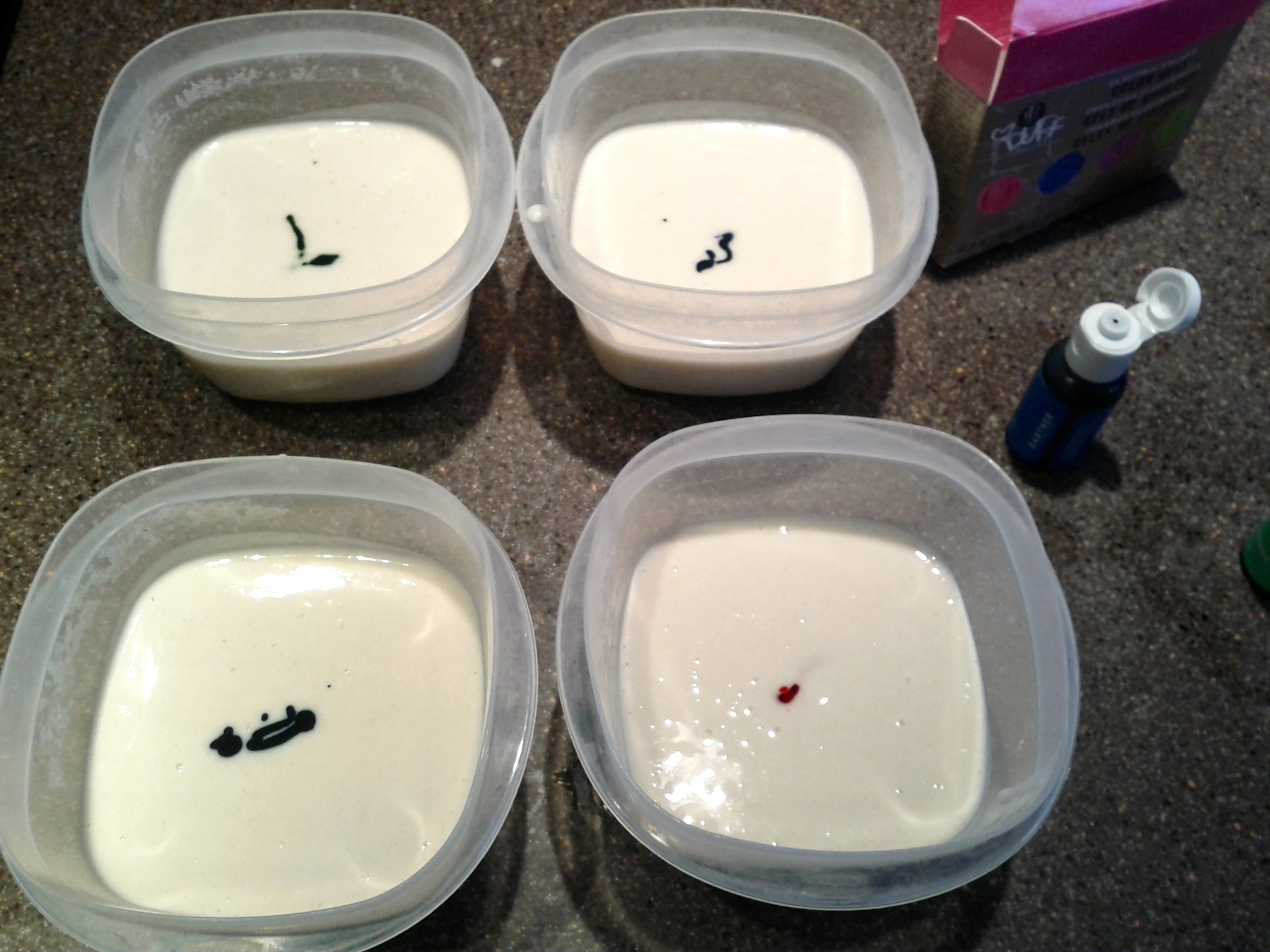Divide into separate containers and add a few drops of food coloring to each container. Use as much or as little food coloring to achieve your desired color.