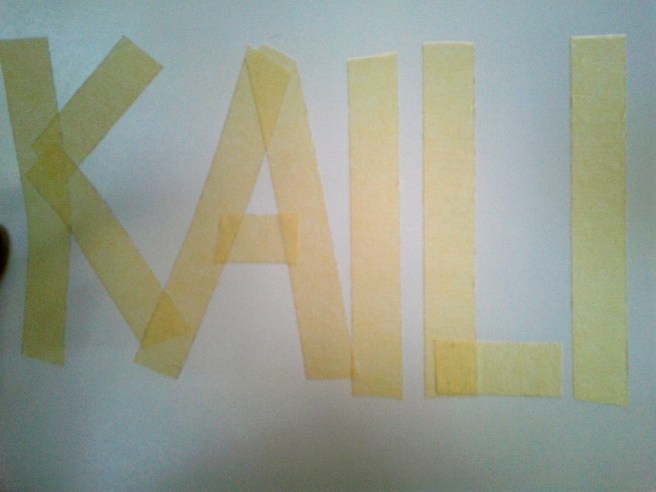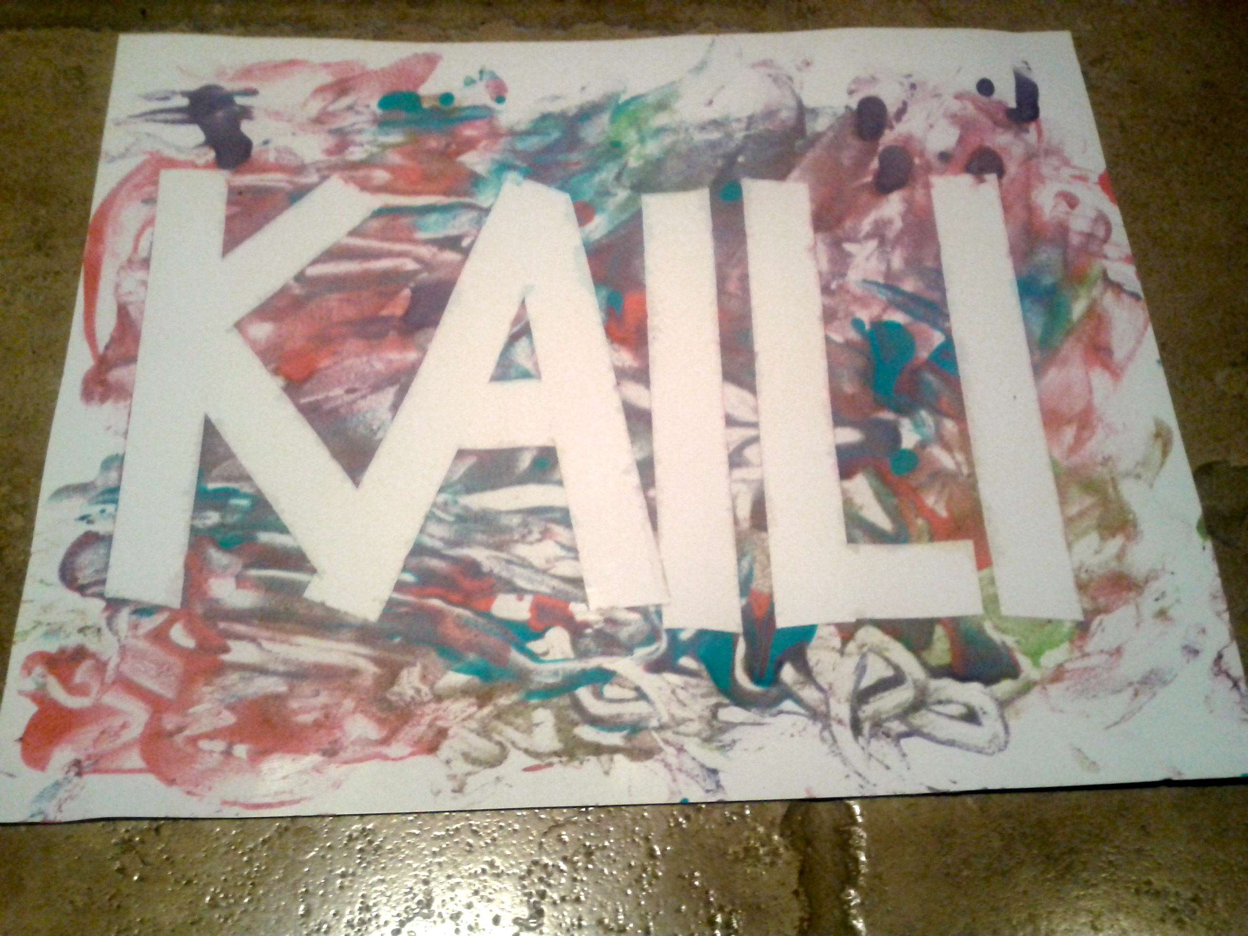 The next thing I did was tape off Kaili’s name on a big piece of white paper, like this. I have a plan people!