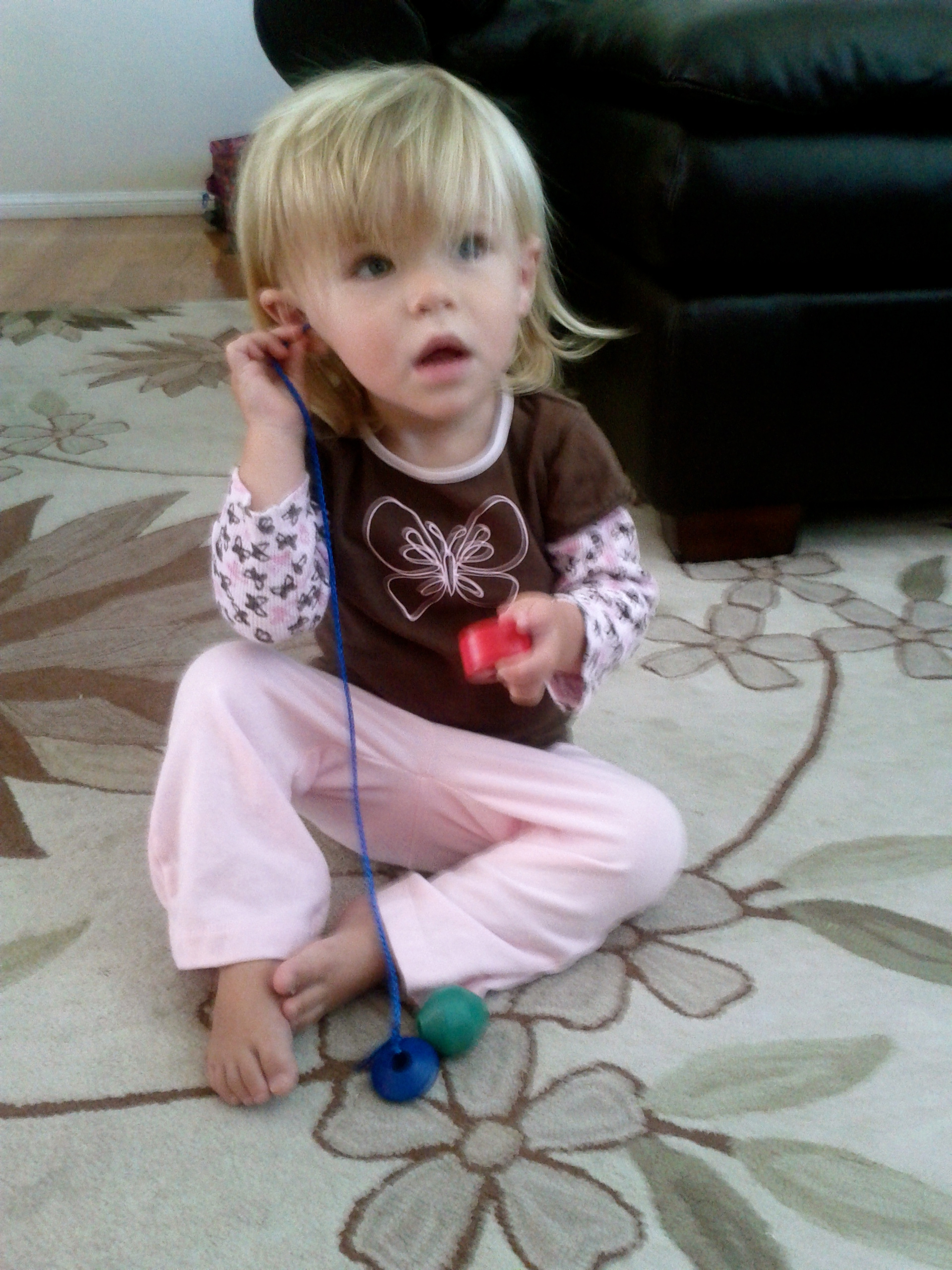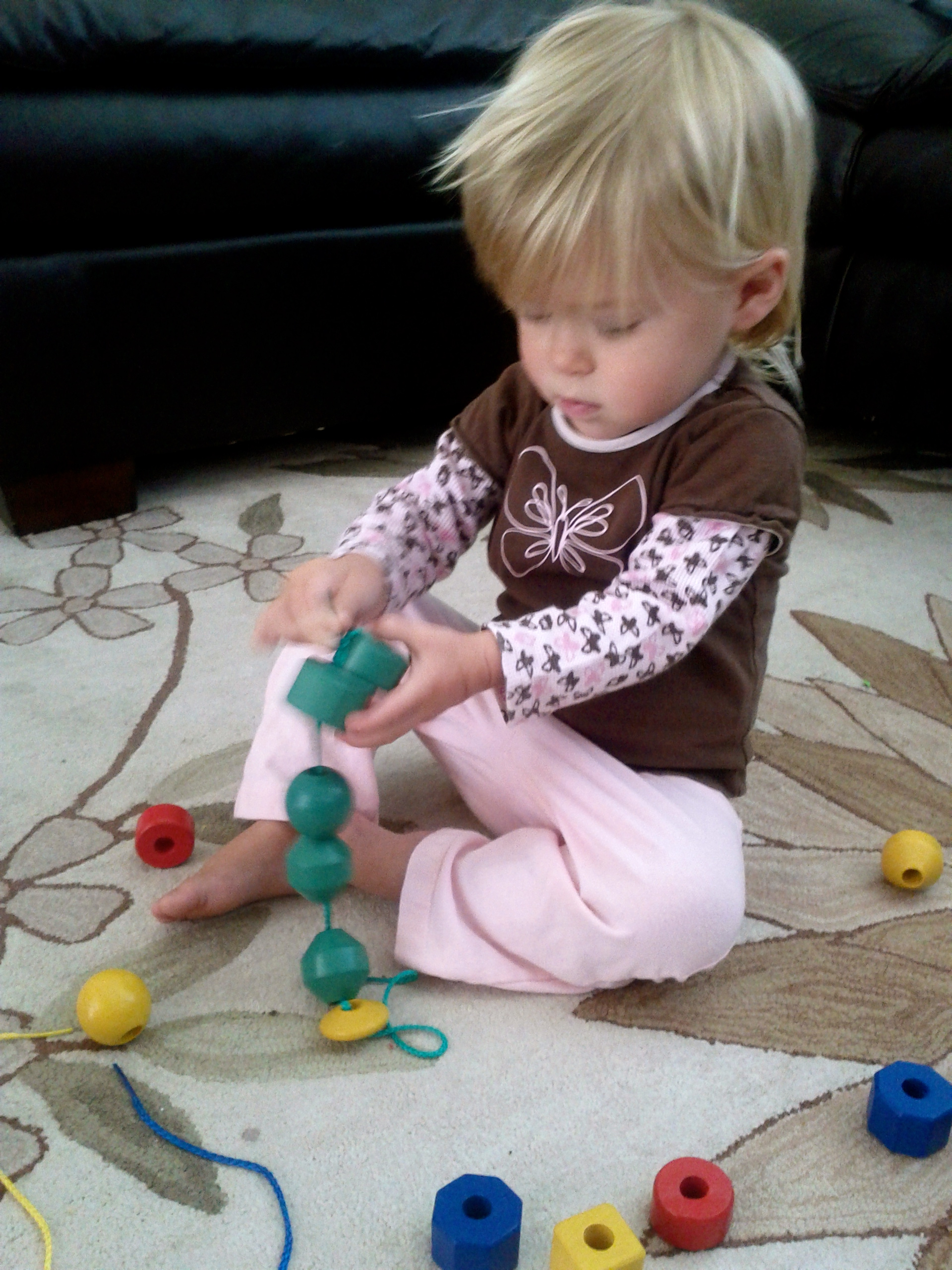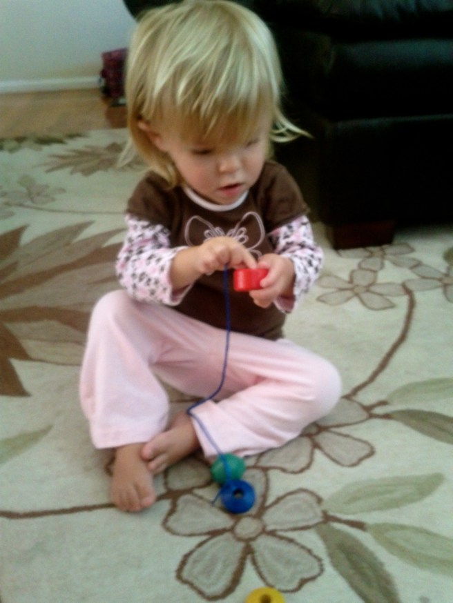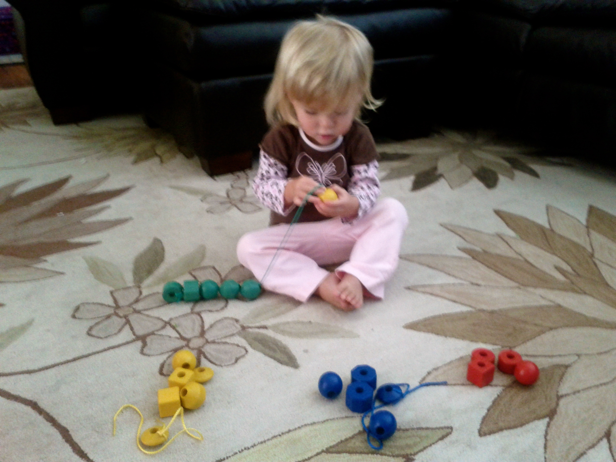I gave Kaili some  toys to sort  and string for a fine motor activity while I made dinner. It was fun to watch her brain and little fingers at work.