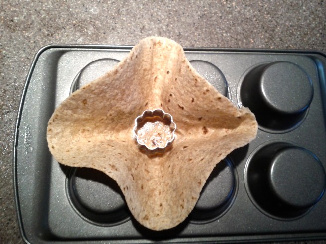 Place a warm/softened and lightly oiled tortilla {microwave for 10 seconds} in between the cups of an upside down muffin tin. Like this…