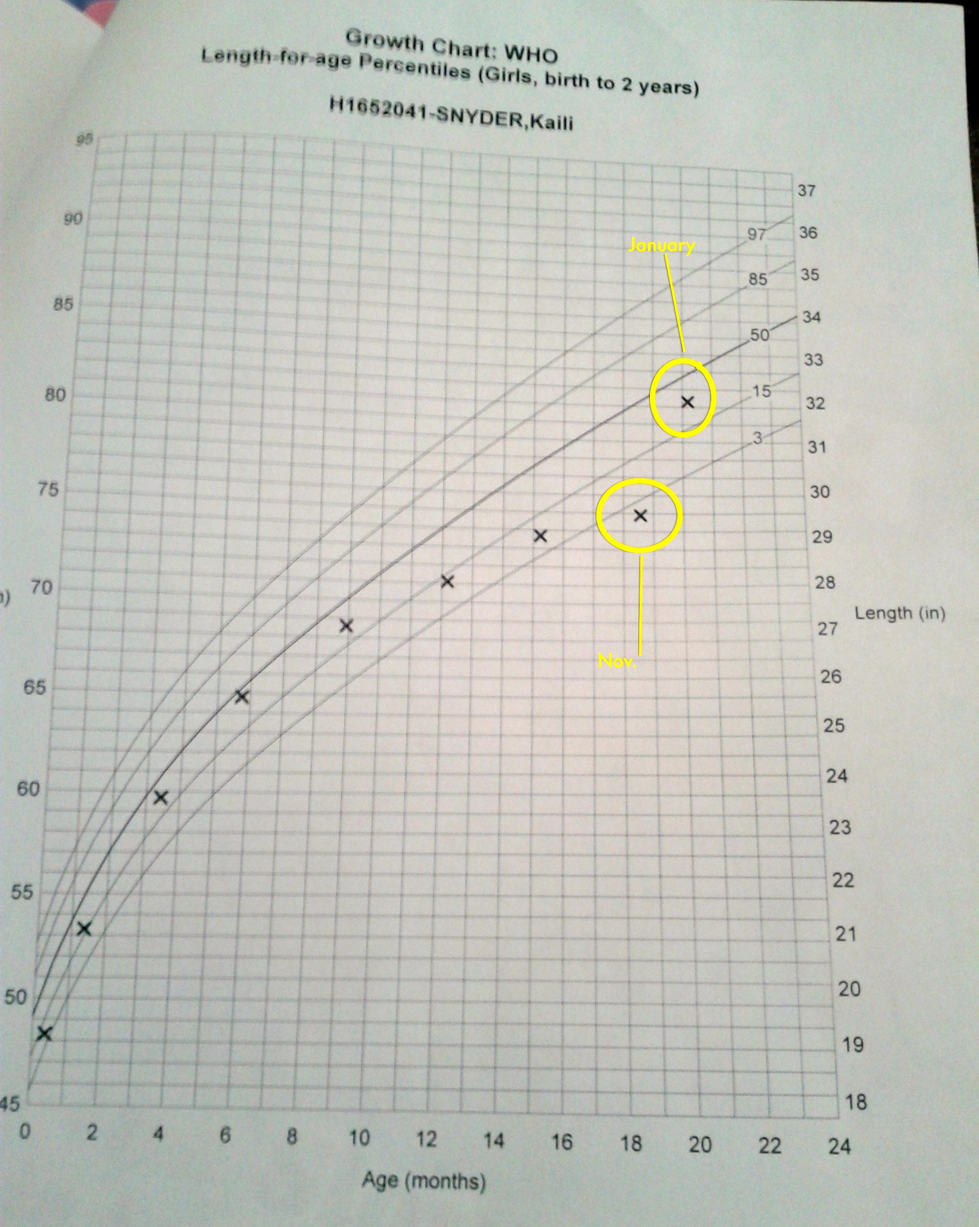 Today we went back to the Dr. for her growth check. In November her weight and height had plateaued. I was almost positive it was because she had gotten a bad cold back in October and really wiped out her appetite. Two months later she has gained a pound and her height has jumped up quite a bit. I mean she is still itty bitty but the Dr. was happy to see things moving in the right direction.