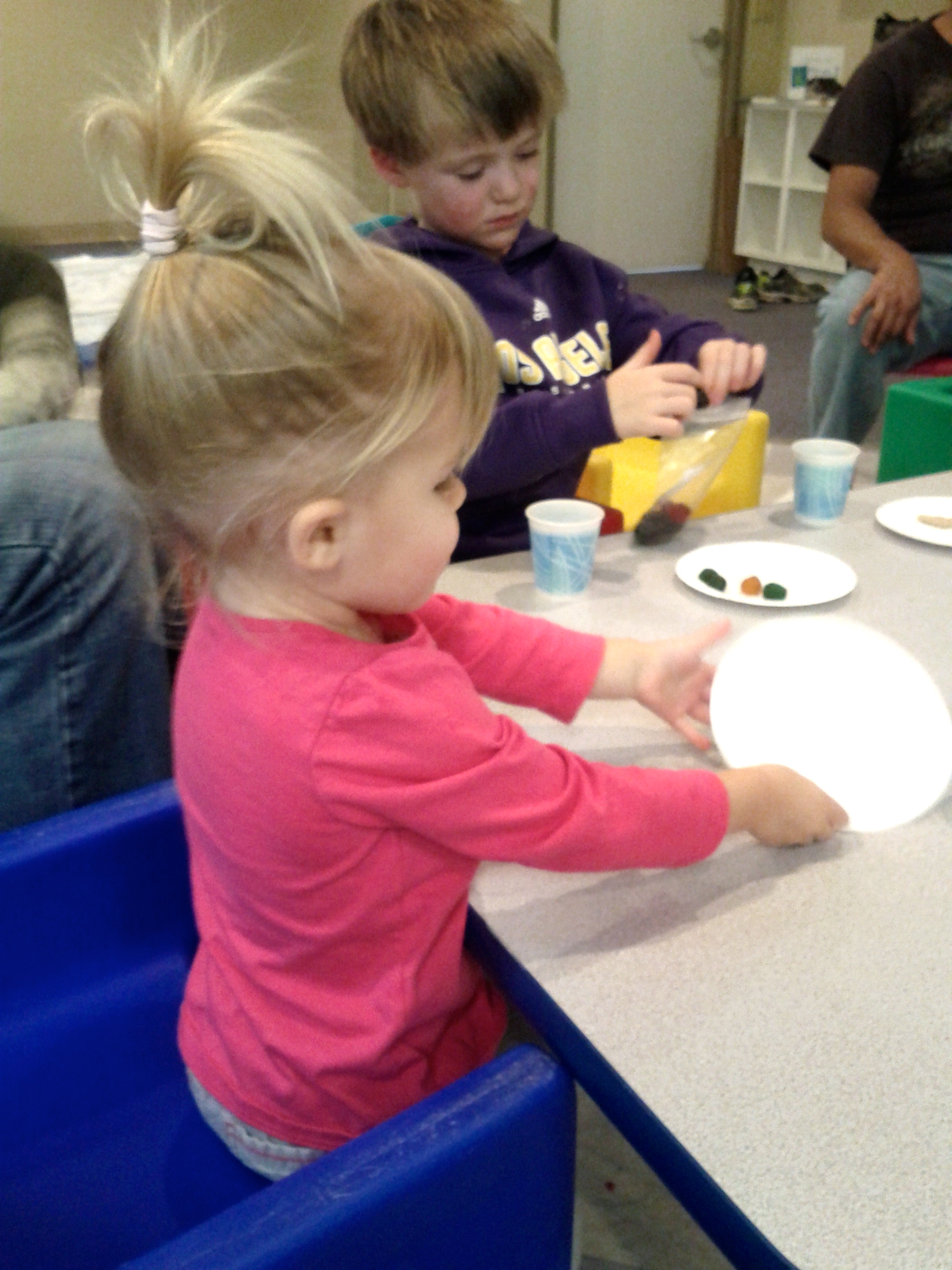 She is in a speech class now and it’s once a week at Rady’s Childrens Hospital. The teacher is speech pathologist and at the end of the class {6 weeks} we will be told what our next step will be. It’s an hour long deal, the kiddos start at circle time, sing songs and read stories and then they play at the table with a manipulative toy or a creative activity. After clean up, they all sit at the table for snack time, it’s cute to watch. Throughout the class language is prominent, we ask the children a lot of questions and repeat certain words over and over along with using sign language.