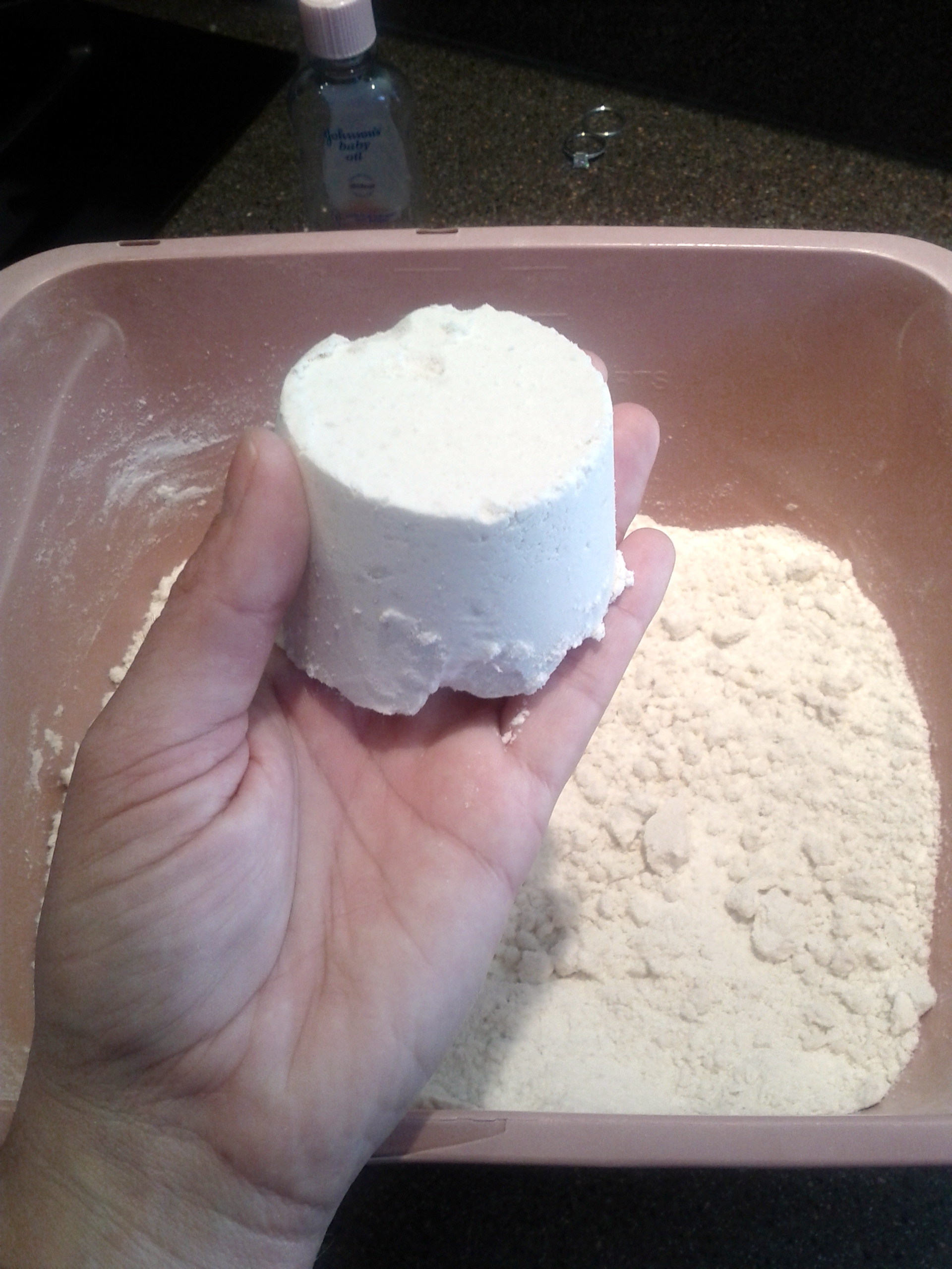 Combine 4 cups flour and 1/2 cup baby oil and mix well. I used my hands but I imagine a pastry cutter would work even better.