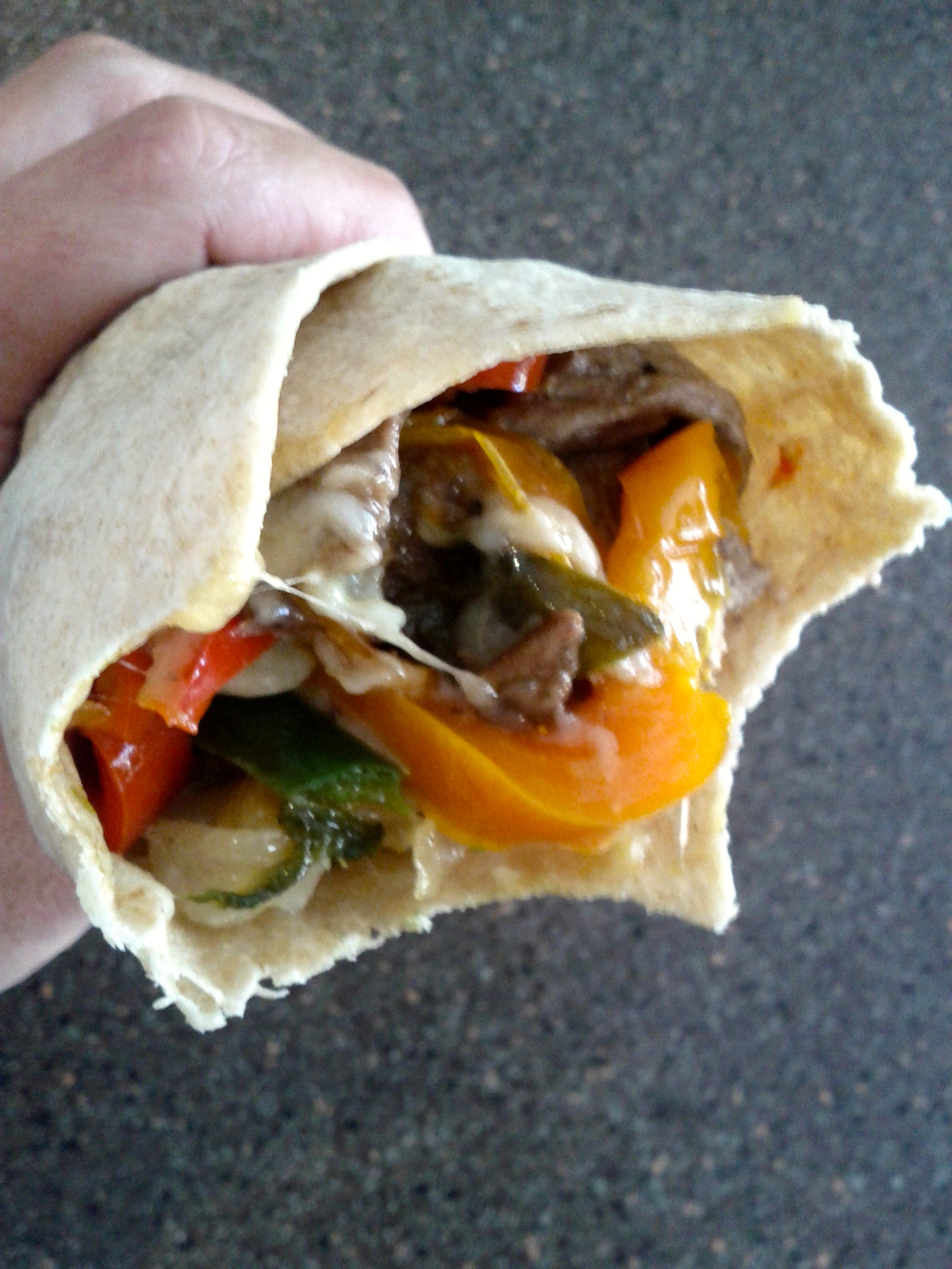 I came across Bobby Flay’s Philly cheese steak recipe on Food Network and thought, now that sounds good. It would be even better wrapped in a tortilla. Bingo, this is a winner winner chicken dinner.