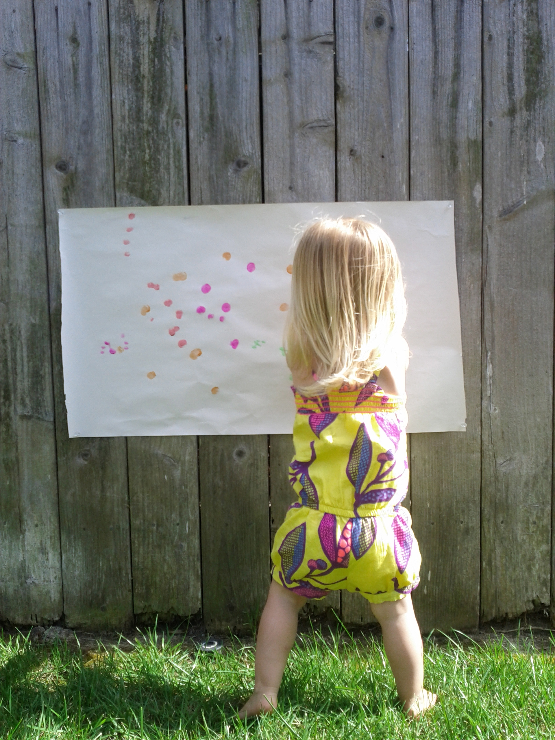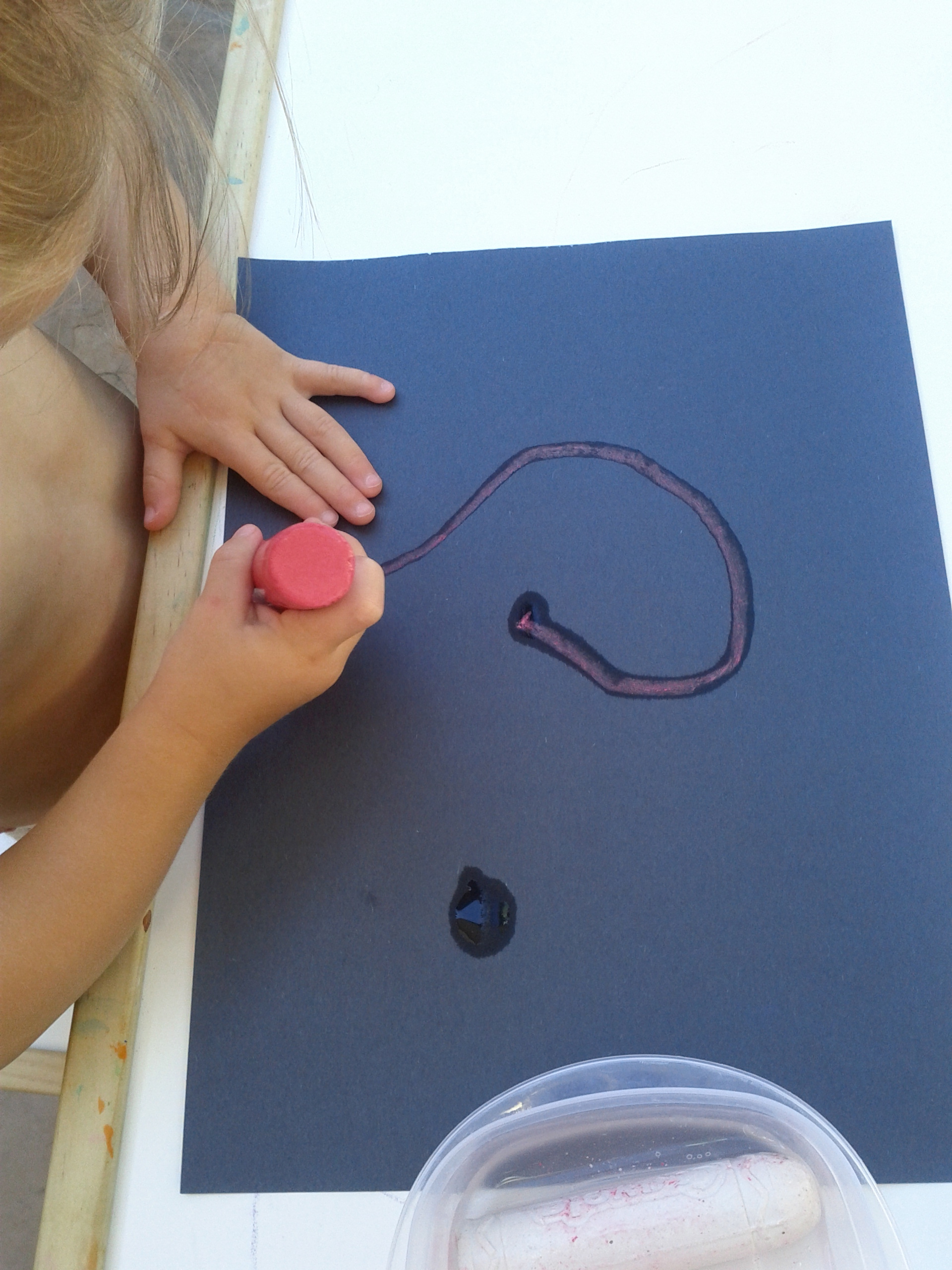 Printing is an extension of painting, it involves less whole-arm activity and greater concern for placement and overall design. I really saw this in Kaili this last time, she was very careful about finding an “open” spot for her next print. You can use anything for printing. Blocks, puzzle pieces, cups, vegetables,utensils, balls, toy animals, cars, shoes…anything.