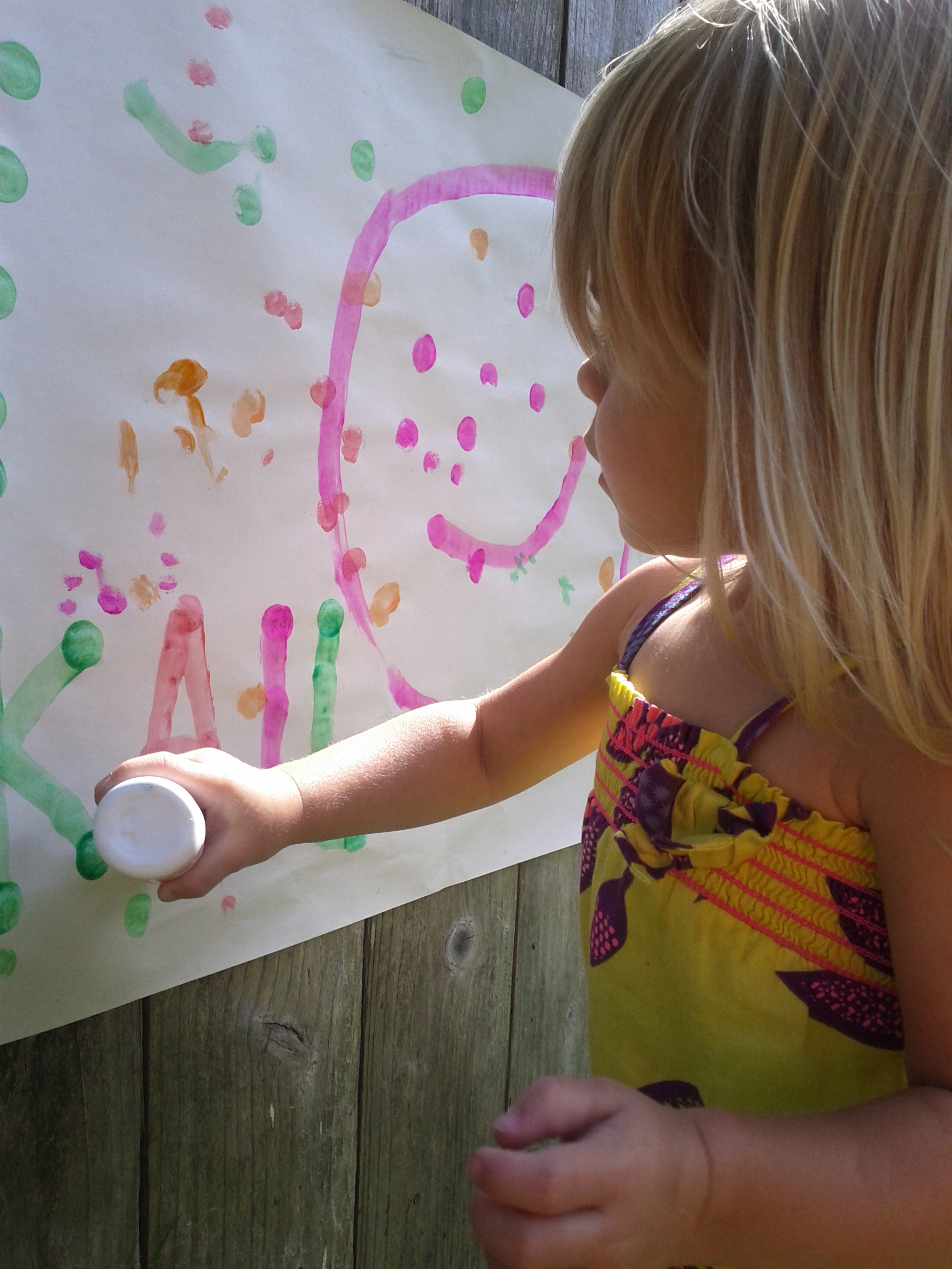 Remember art need not be restricted indoors, it’s a great activity to have available to the children while they are playing outside. If you don’t like the mess, give them a paint brush and a bucket of water and let them paint their surrounding, [the ground, bricks, trees, or rocks} with water.