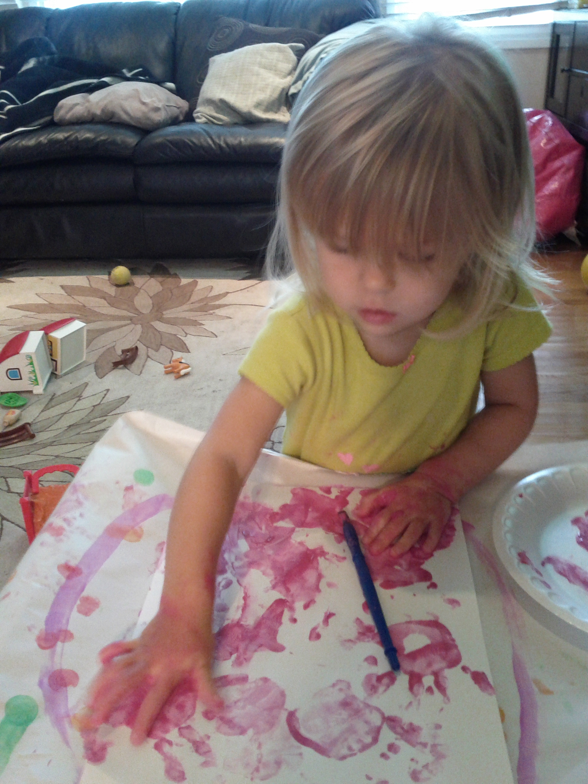 Some children love to get messy and some don’t. Mine teeters a fine line between both. With gentle encouragement Kaili was soon painting her hand and getting into it.