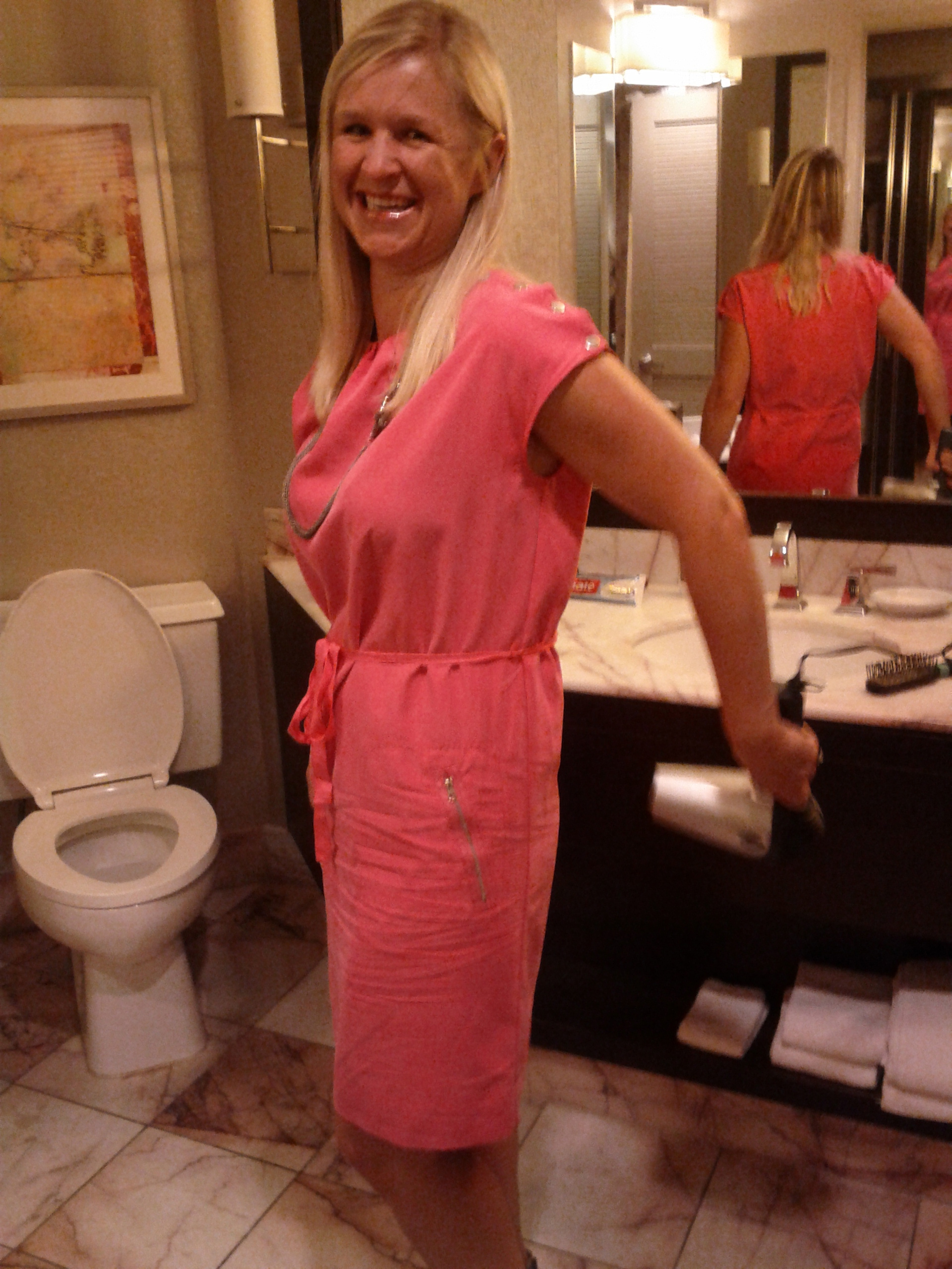 I told her it looked like she backed her ass up into a fountain. We slyly made our way bathroom to “air dry” her lady lumps.