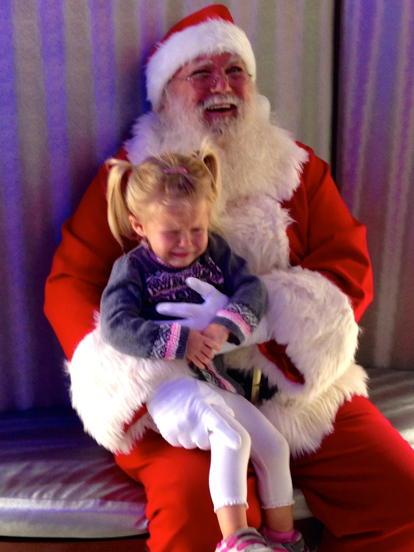 Yesterday was the first day that I have felt like crud the entire day. If I could have stayed under layers of blankets and slept sun up to sun down I would have. I mustered up enough energy to take K to see Santa. We had talked about it, we have been reading books about Christmas and she knows he is watching her…kind of spooky actually. She was pretty excited about it until he started walking toward us waiting at his “cottage.” She stiffened up, grabbed ahold of me and jumped into her stroller. Scary Santa was on his way and she wasn’t digging it. It’s a lot harder to not pick her up than one might imagine. Our time came for pictures and she walked up to him holding my hand but when it was picture time she about lost it. She was trying hard not to cry, which came close to breaking my heart but once her feet were safely planted on the ground she was fine and breaking into his stash of candy canes.