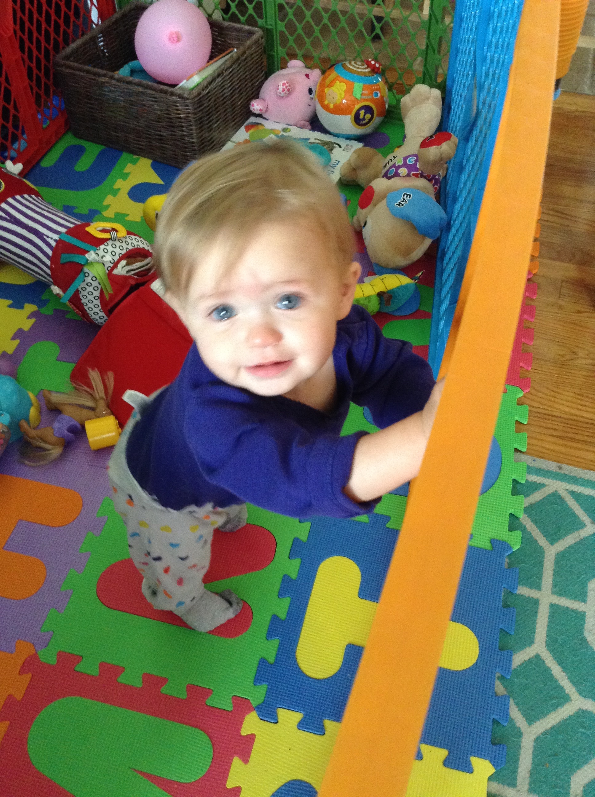 In her defense, she is getting two more teeth, so that probably isn’t helping. She has also mastered pulling herself up on furniture or anything sturdy or not. But she is afraid to sit back down because she has bumped her chin a couple of times. This is a big problem, huge problem. She will be happy and crawling around then she will reach the couch and pull herself up and then cry. Then someone, usually me will go to her and help her sit back down and she will cry even harder. This continues all day long. She does the same thing in her crib, so that’s how that goes.I think she just wants to walk and strut around the house like she owns the place and honestly I will welcome that if it stops the crying.