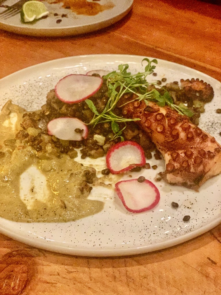 Next, some grilled octopus over lentils and pipian mole, aka pepita mole. I don’t think we liked it much.