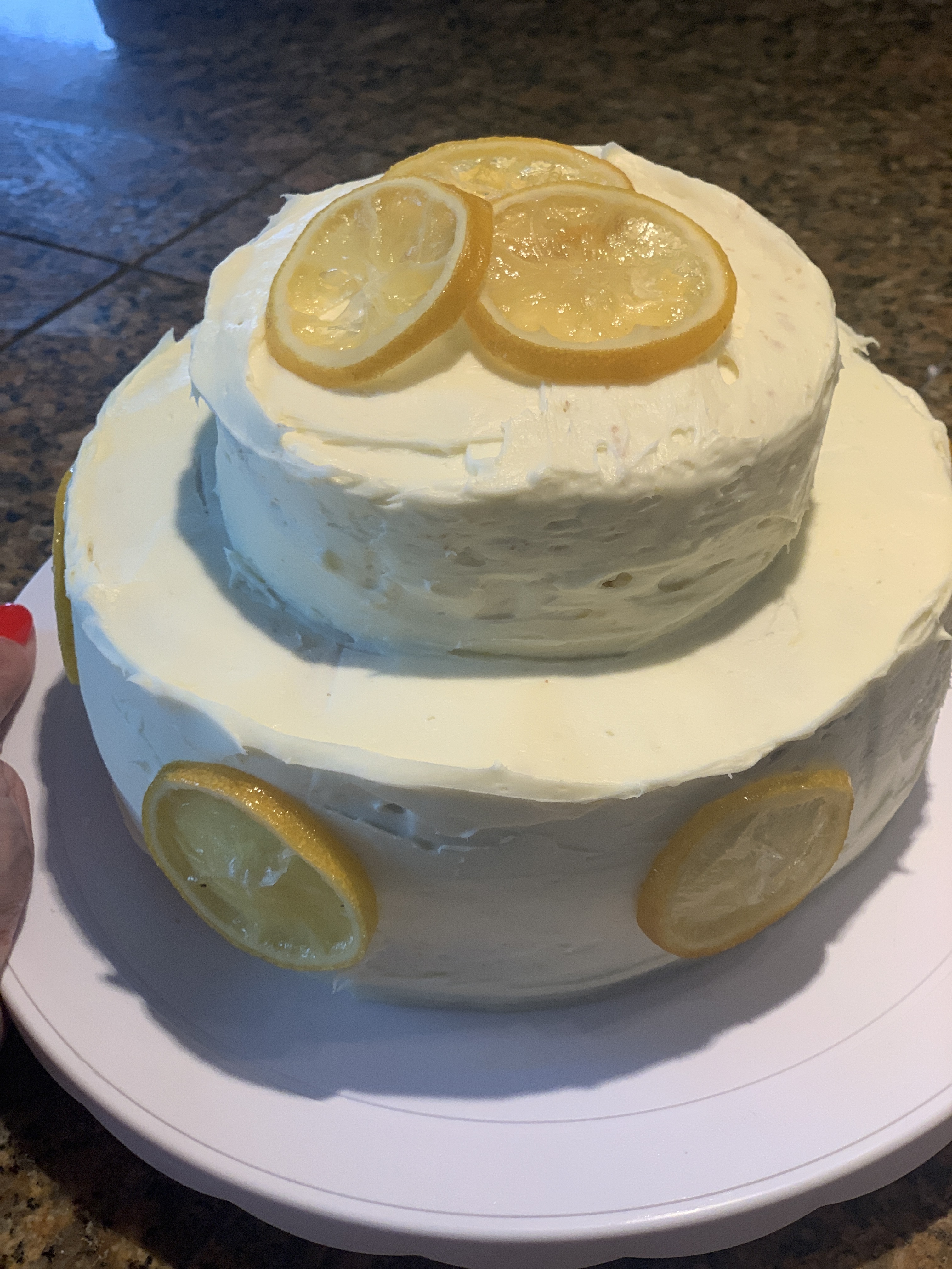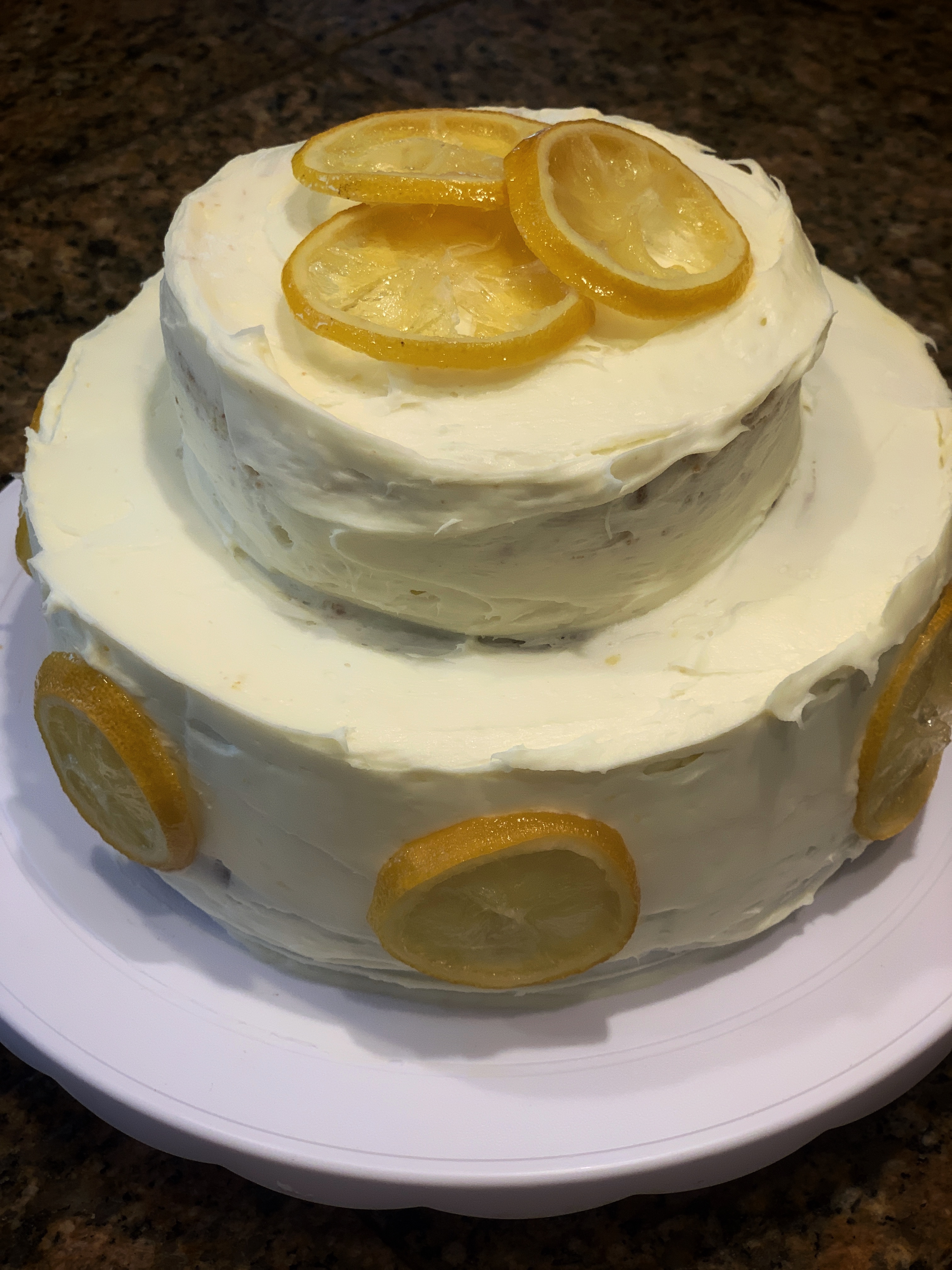 Lucious lemon cake with lemon cream cheese frosting and candied lemons, you’re welcome.