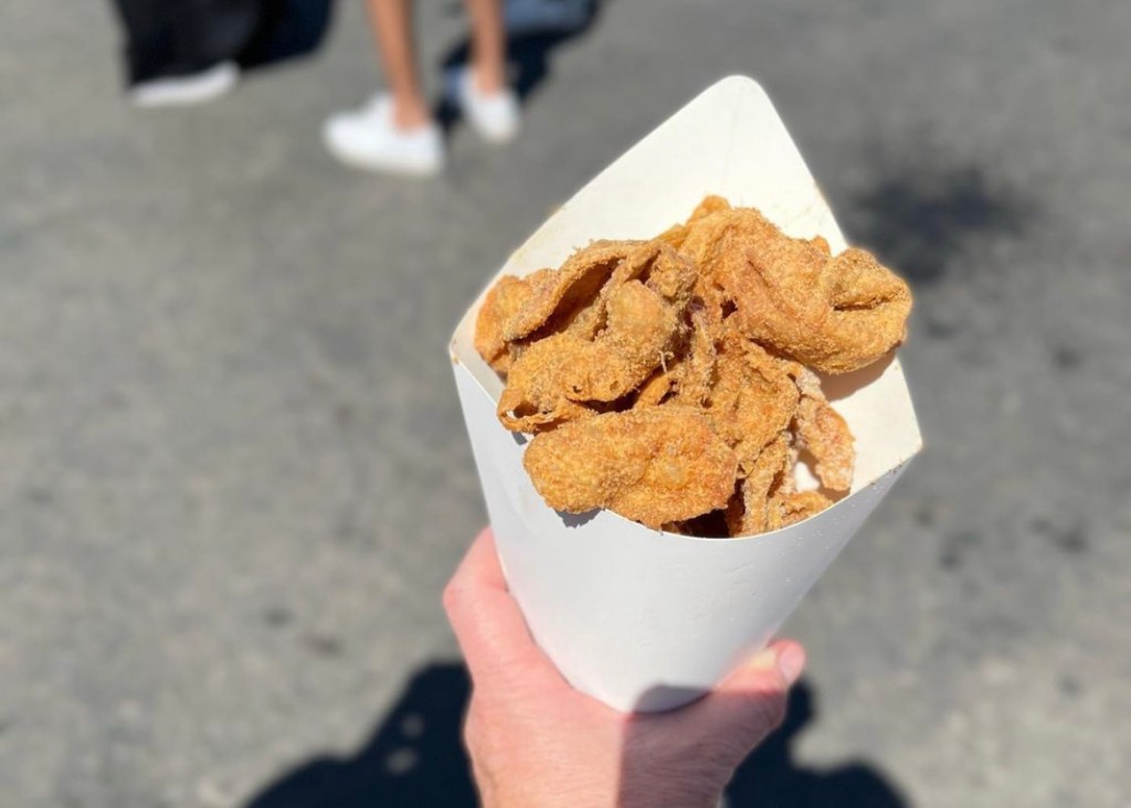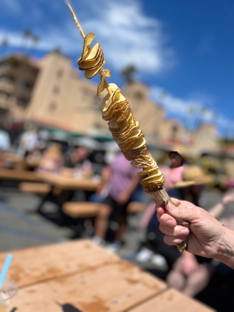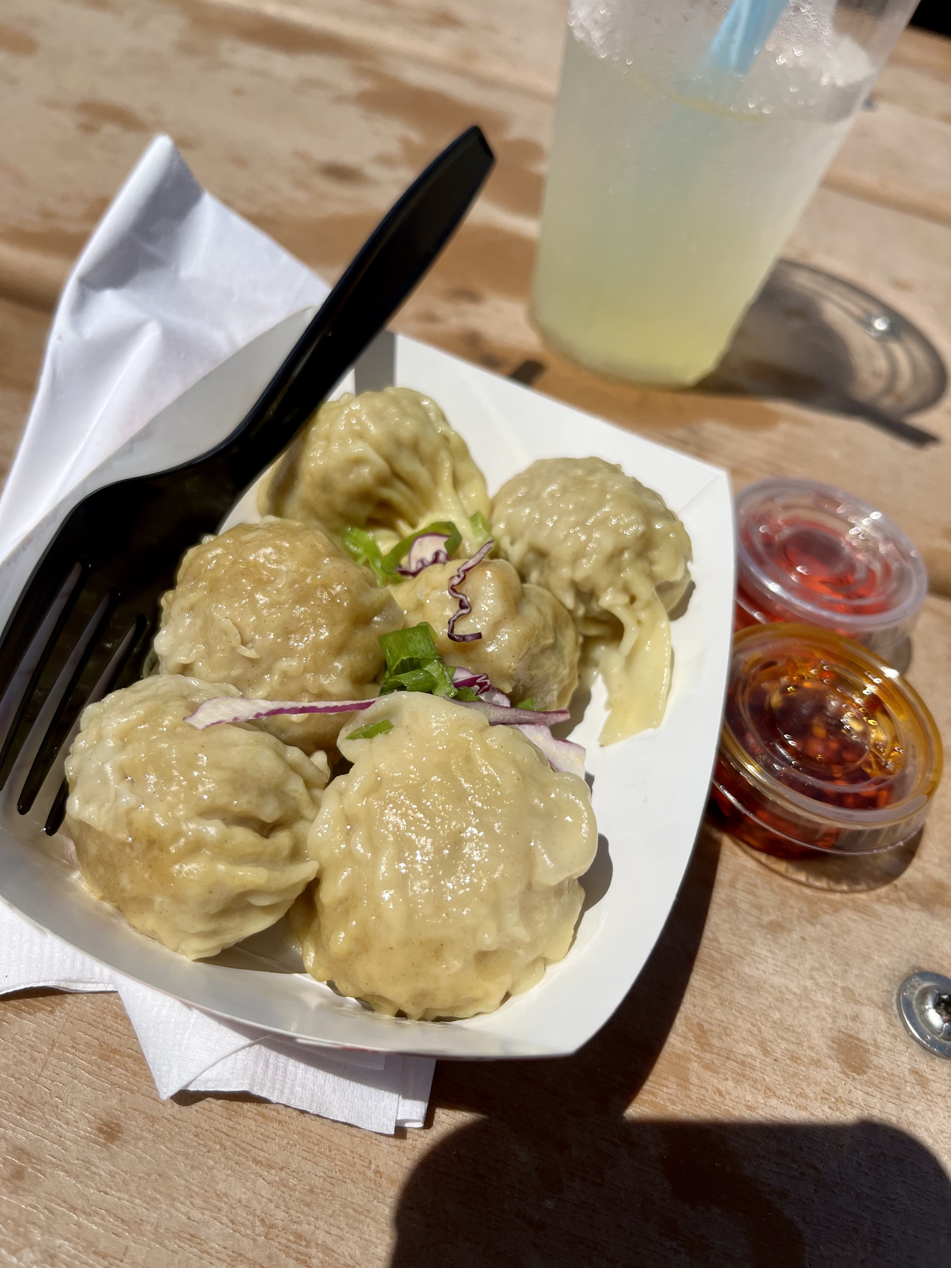We stopped and ordered a beverage and took a lap around scouring our options. I am going to come right out and say it, totally underwhelming. I mean, they had everything you could think of, well except a lobster roll. Wings, noodles, musubi, grilled lobster, dim sum, Ube desserts, oysters, cotton candy, grilled cheese, Indonesian satay, which I really wanted, but not bad enough to wait in a 30 minute line. Anyhow, you catch my drift. Even with all of these options, nothing really jumped out at us. We ended up getting the fried potato twister and some dumplings. They were both good but the potatoes were heavily salted.