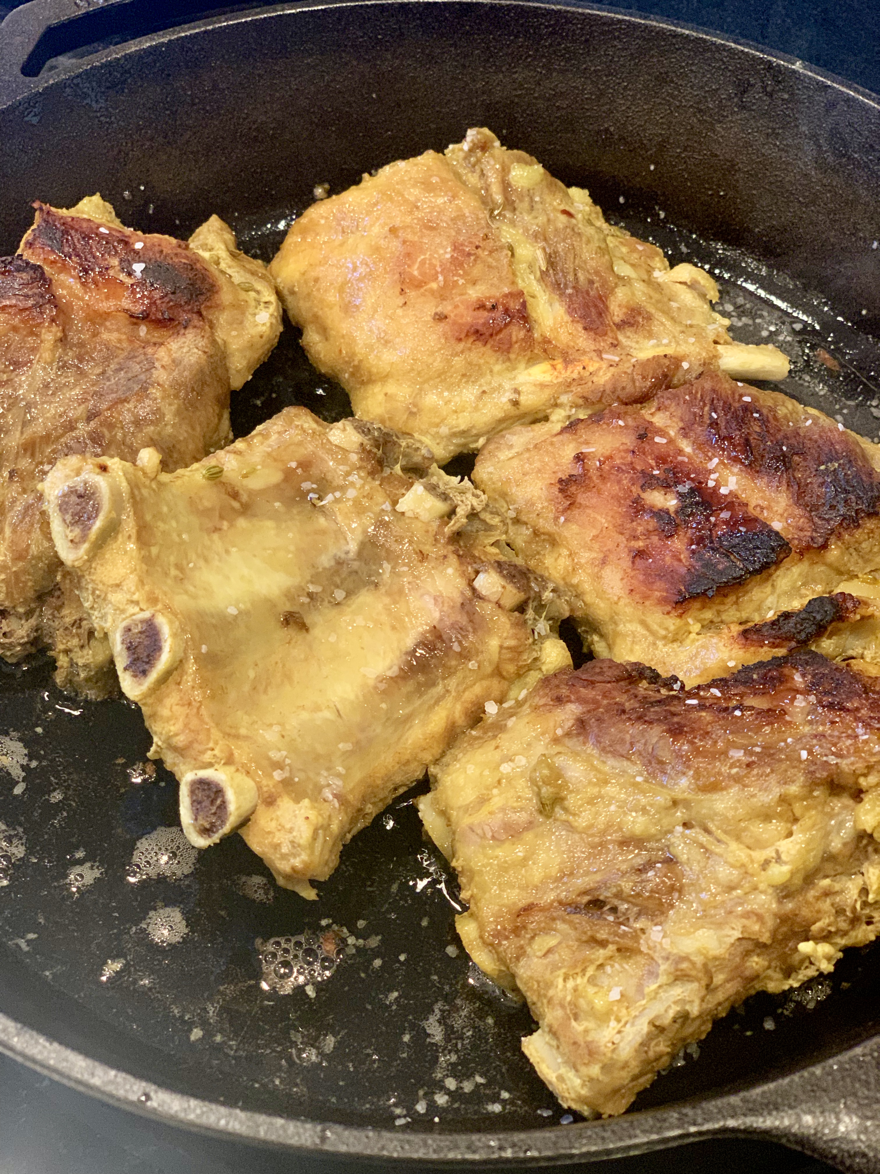 I heated a cast iron pan, added some ghee, and lightly sprinkled some cane sugar over the ribs (not in the recipe) and fried them until perfectly caramelized.