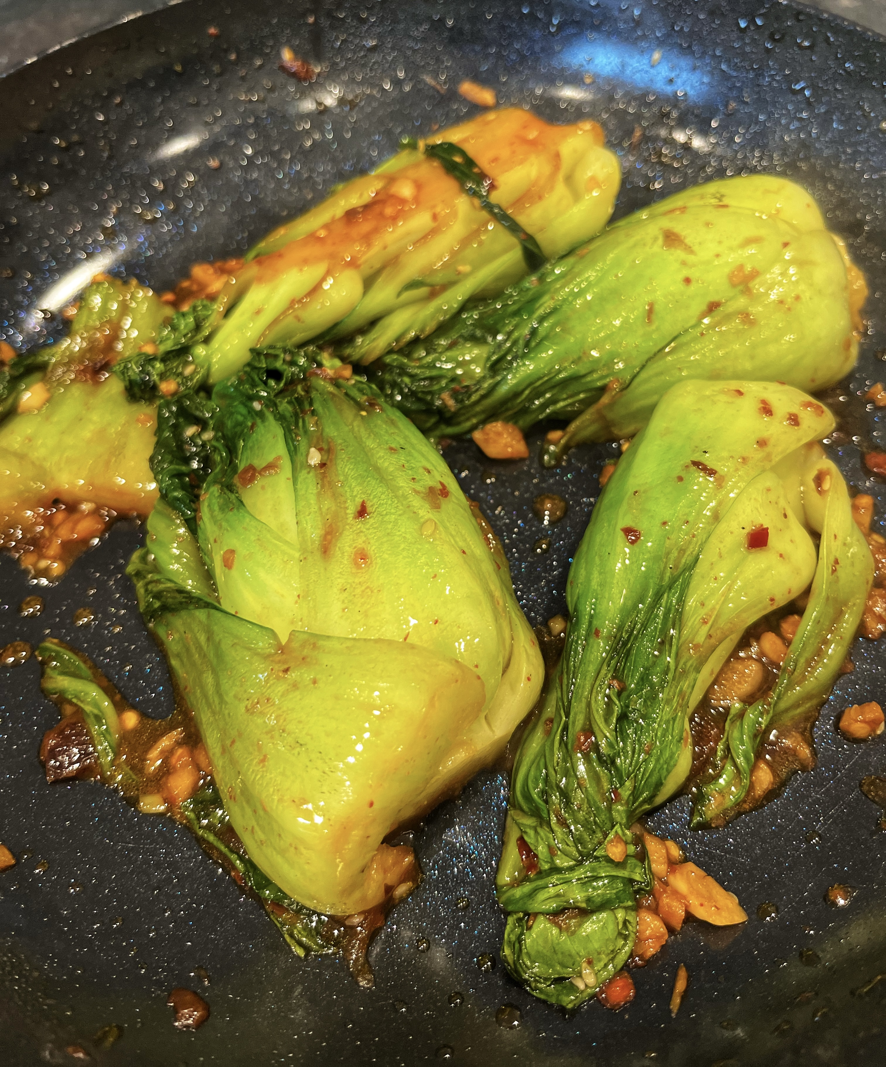 On another note, one thing that I have been cooking lately is baby bok choy. I have neglected this vegetable. It’s super quick and simple to cook up and is so tasty. I just halve the bok choy, sauté in some sesame oil with garlic. Add soy sauce and chili crisp then cook until tender, around 10-12 minutes.