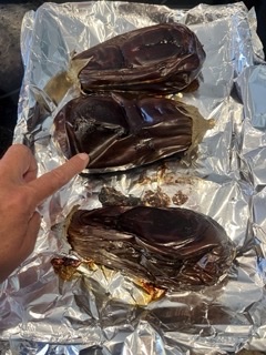 Preheat oven to 425. Pierce eggplants all over with a fork. Place on baking sheet. Roast in oven until eggplants are very soft and deflated, turning once about one hour. Cool slightly.