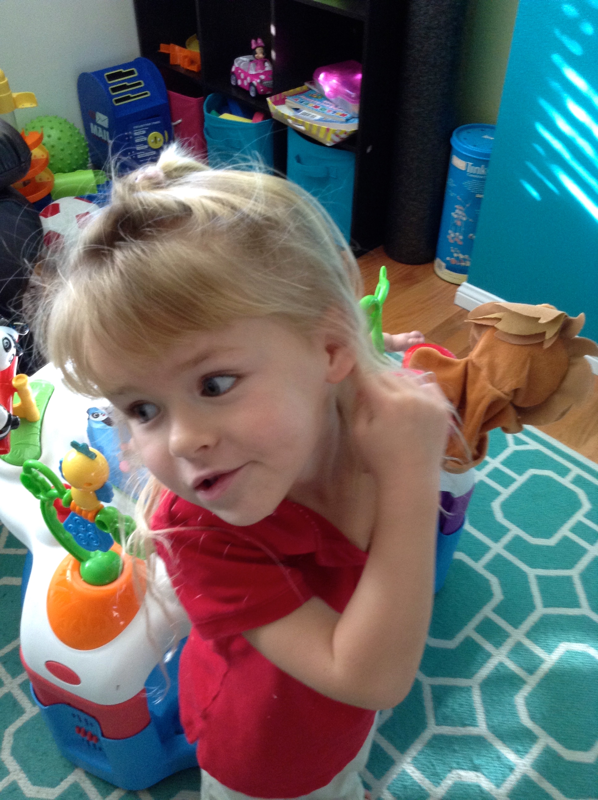 She is becoming a little football fan. If that sport is on the television she watches. She will even arch her neck to get a better look, it’s funny and a little scary at the same time. I put her on our bed to put clothes away and turned the TV to the NFL network, that gave me almost 1/2 hour.