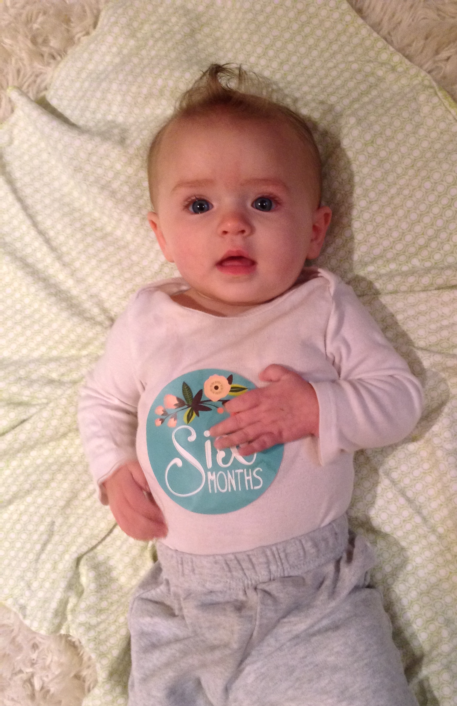 She is on the low end of the spectrum in weight at 14 lbs and at the higher end for height. I look forward to watching her change each month, she’s just the cutest. Happy 6 months Monkey butt.