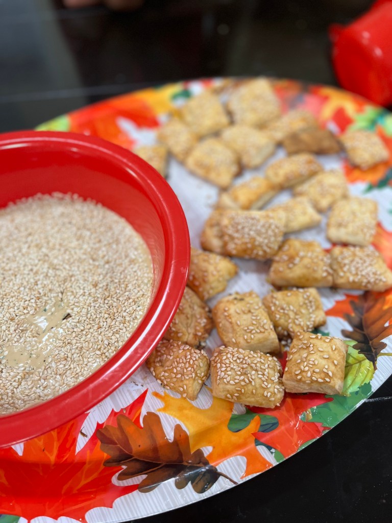 Mongolian sesame flat-bread crackers with a cream cheese spread.