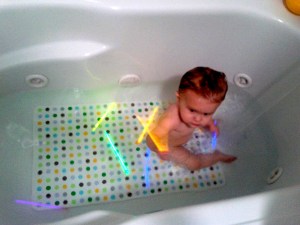 A few years ago, right before I was put on bed rest I worked a Parents Night Out at my school. I had given the kiddos glow sticks to play with and they had a blast when we turned out the lights. Being able to run around a classroom at night, in the dark, proved to be a hit. At the end of the night one of the parents mentioned to me how they will put a bunch of glow sticks in the bath tub and let their daughter take a ” glow in the dark” bath.
