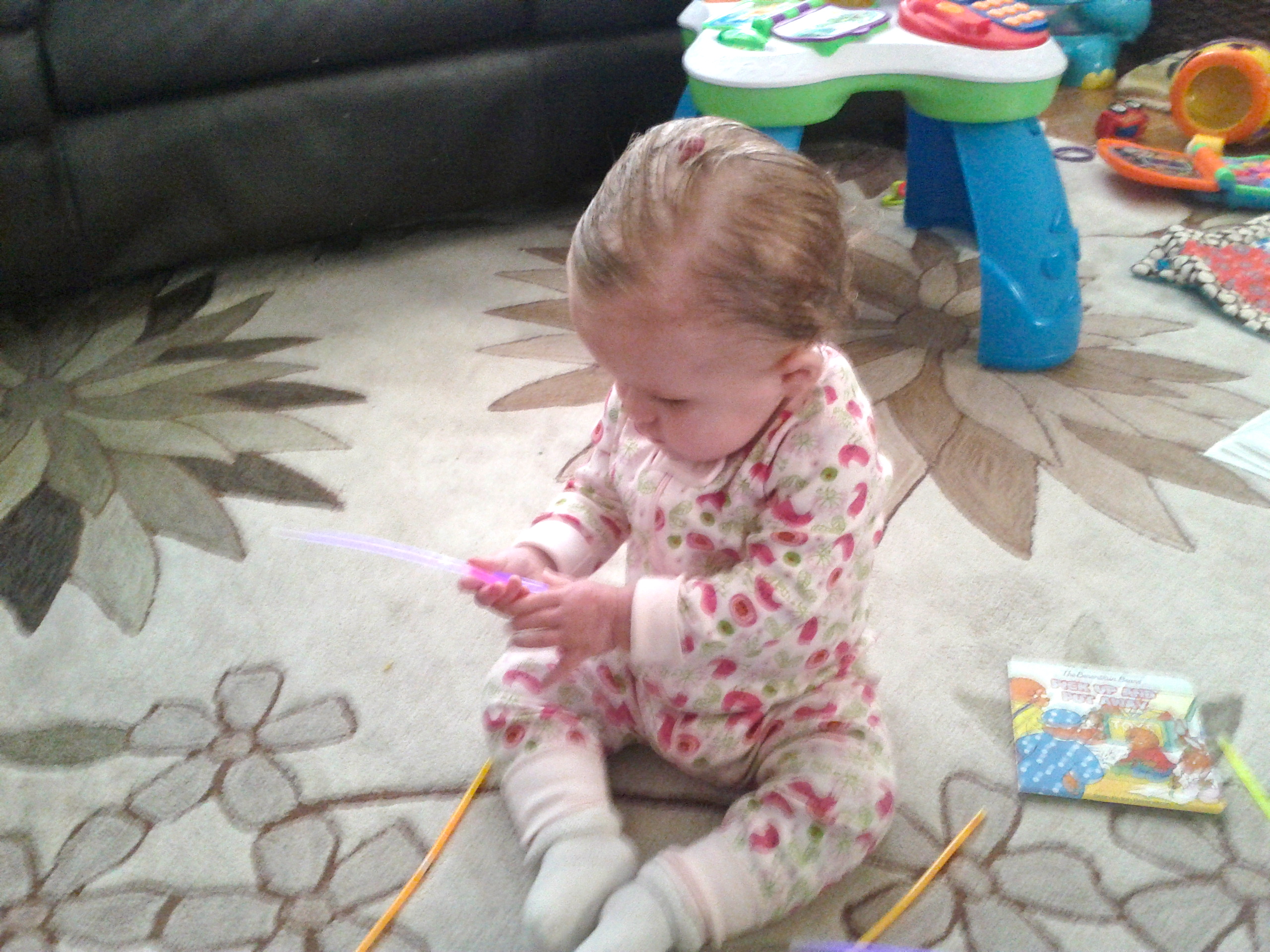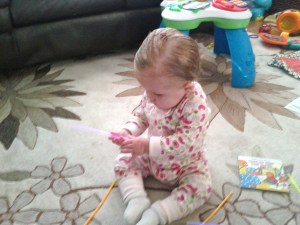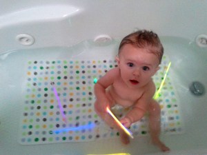 Kaili has been less than impressed with bath time lately so I thought I would give it a try. Only drawback is A. now with the time change, it’s still sunny at 6:00 p.m and B. we have a skylight in our bathroom so it wasn’t very dark but she didn’t mind. She had a blast. I was impressed that she didn’t try to chew on them, she had more fun using them as drumsticks. Her bath lasted almost 30 minutes, that is about 25 minutes longer than normal.