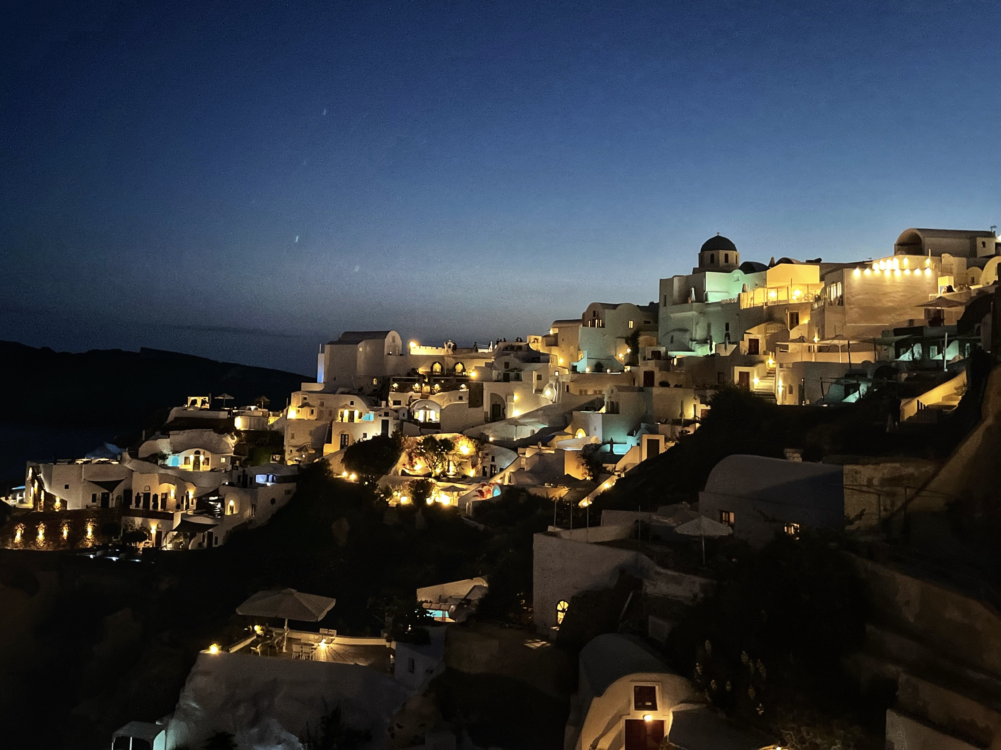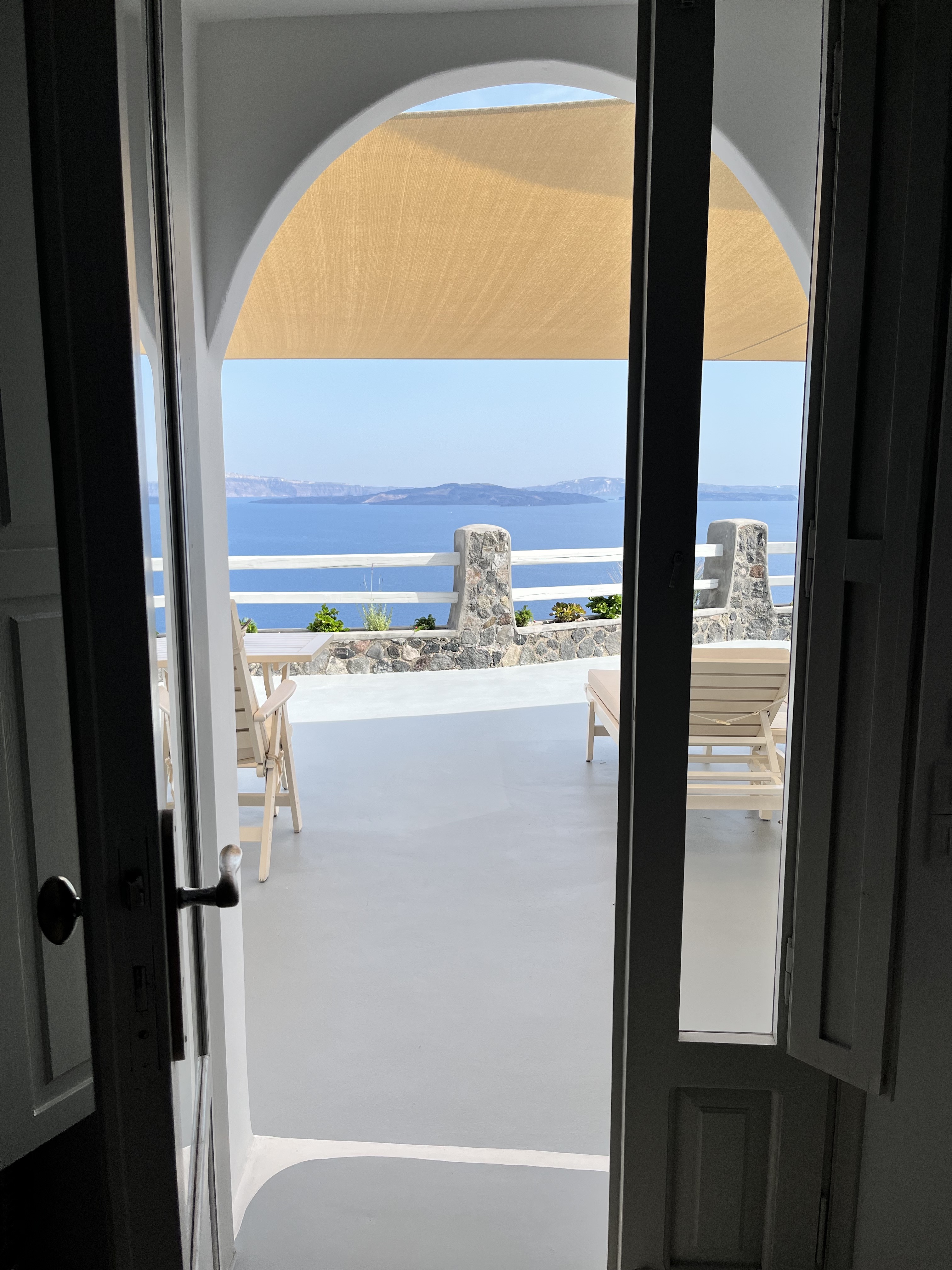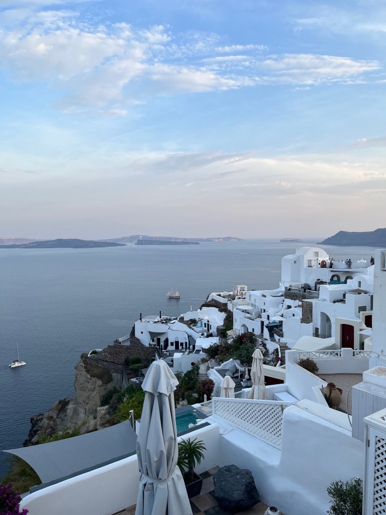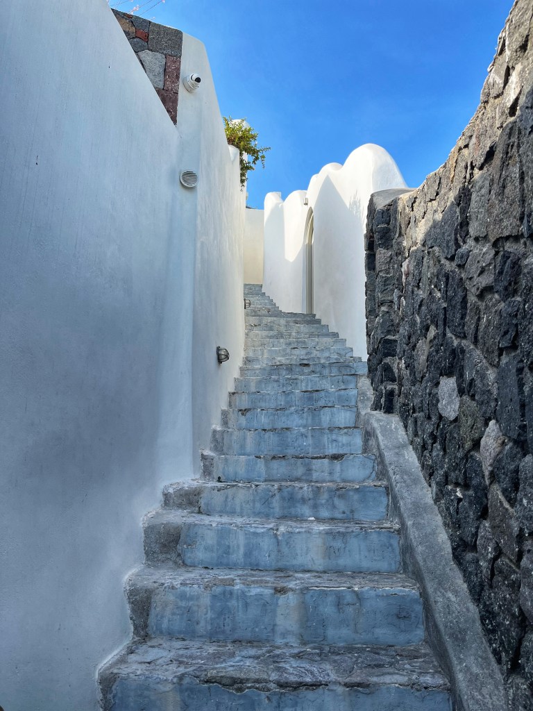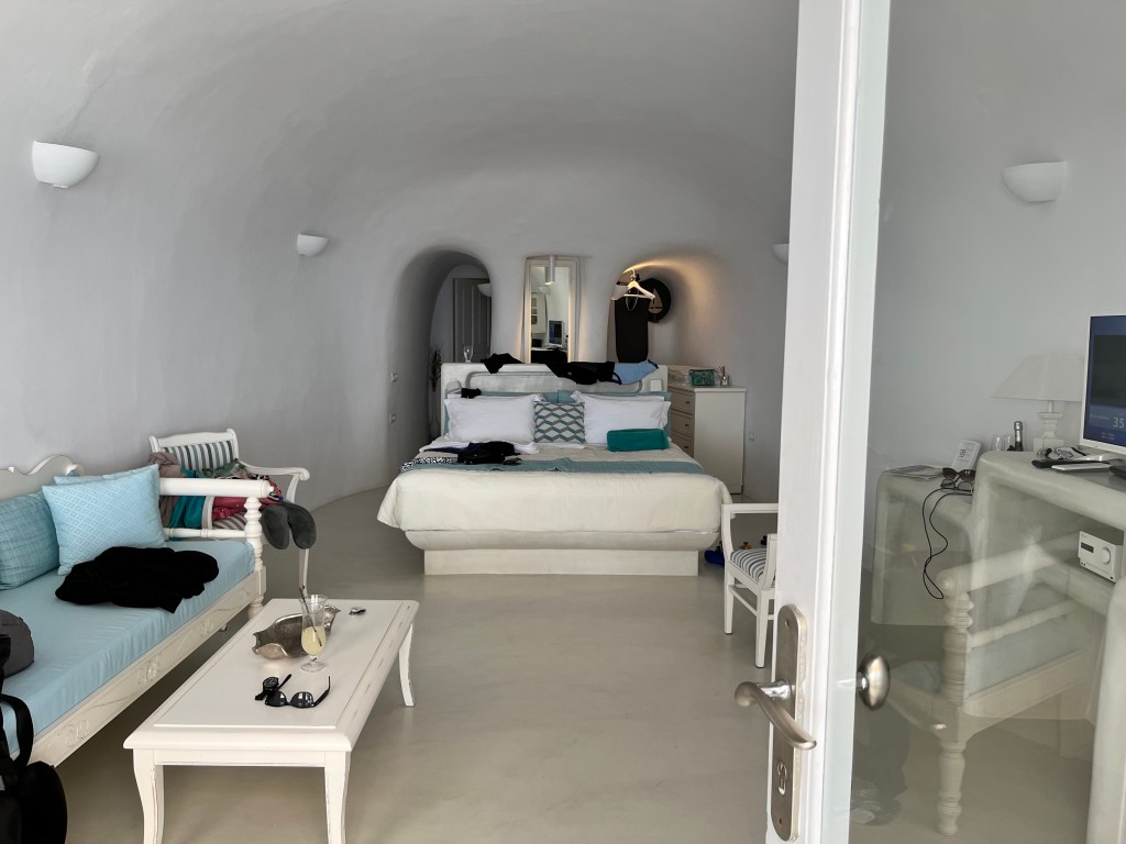 The four of us took a transfer from the airport to Oia, pronounced Eeee-Uh. Our hotel was located at the beginning of the Oia(n)? village. This is the area you see in all of the movies. White buildings that look like sugar cubes perched on the rugged cliffs over looking the Aegean sea. There are blue domed churches dotted along the way, the landscape is breathtakingly beautiful.