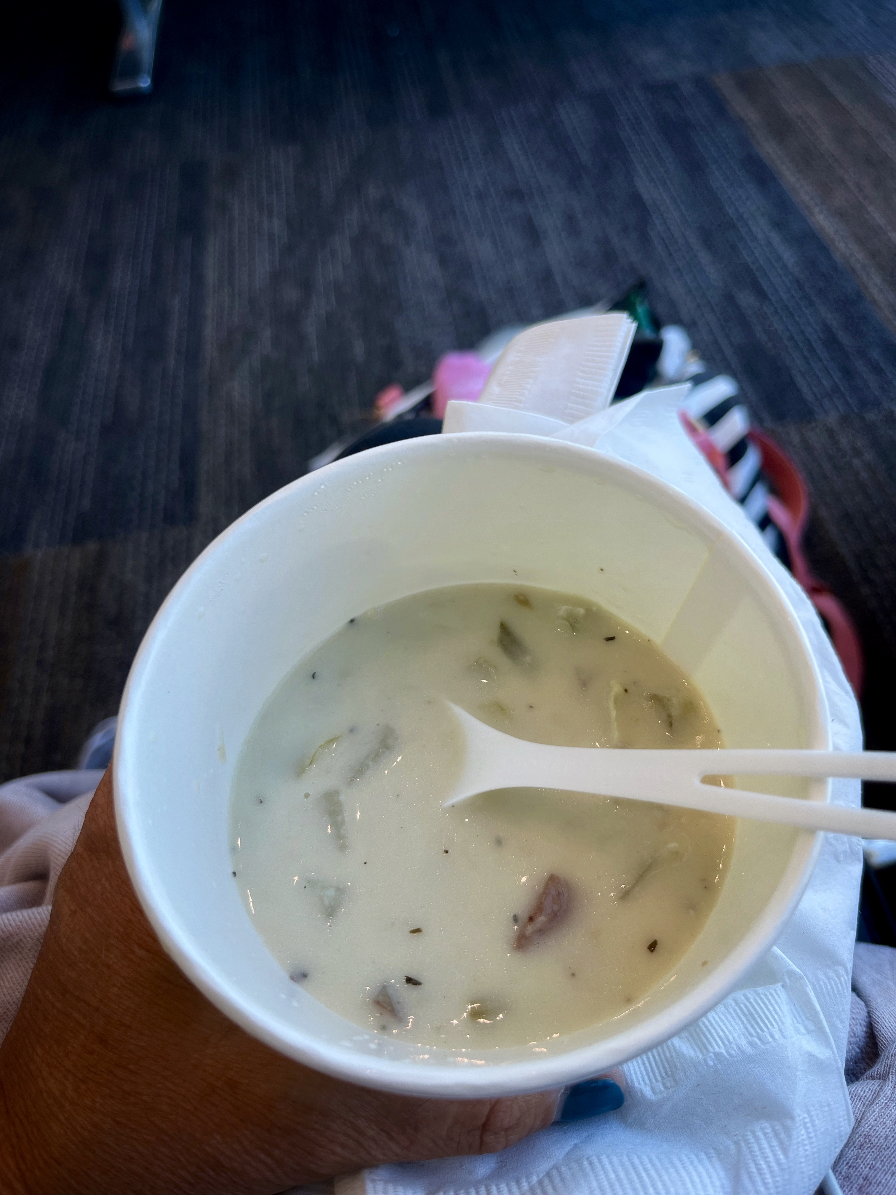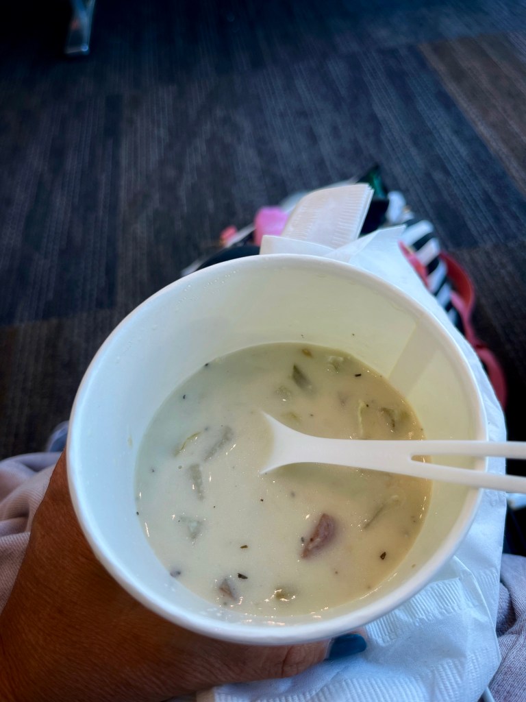 Once we landed in San Fran, we had to walk miles from terminal to terminal to find our gate. At this point we didn’t’ get our hopes up, if the plane and crew showed up, great, if not, great. So we found our gate and grubbed some clam chowder.