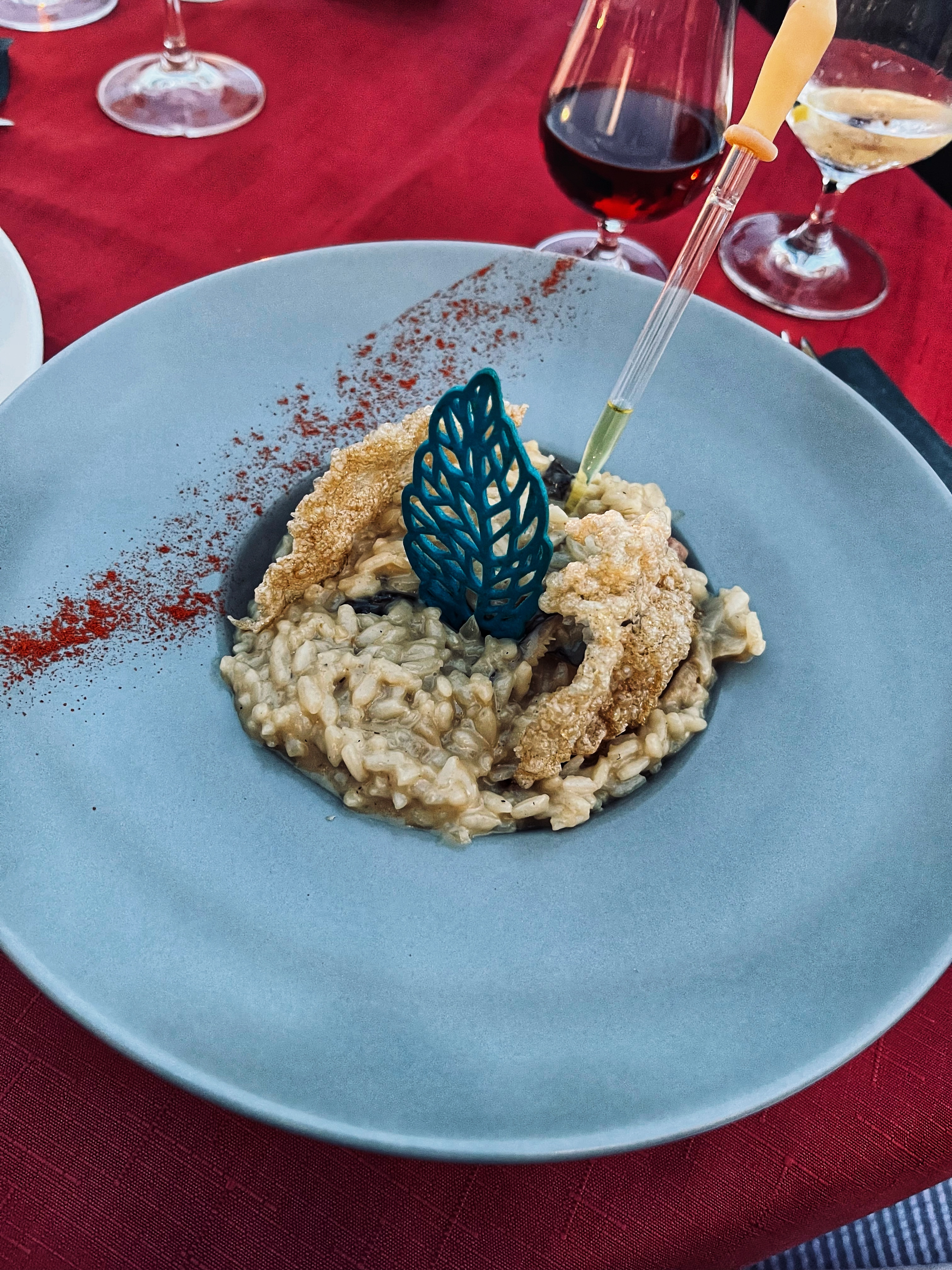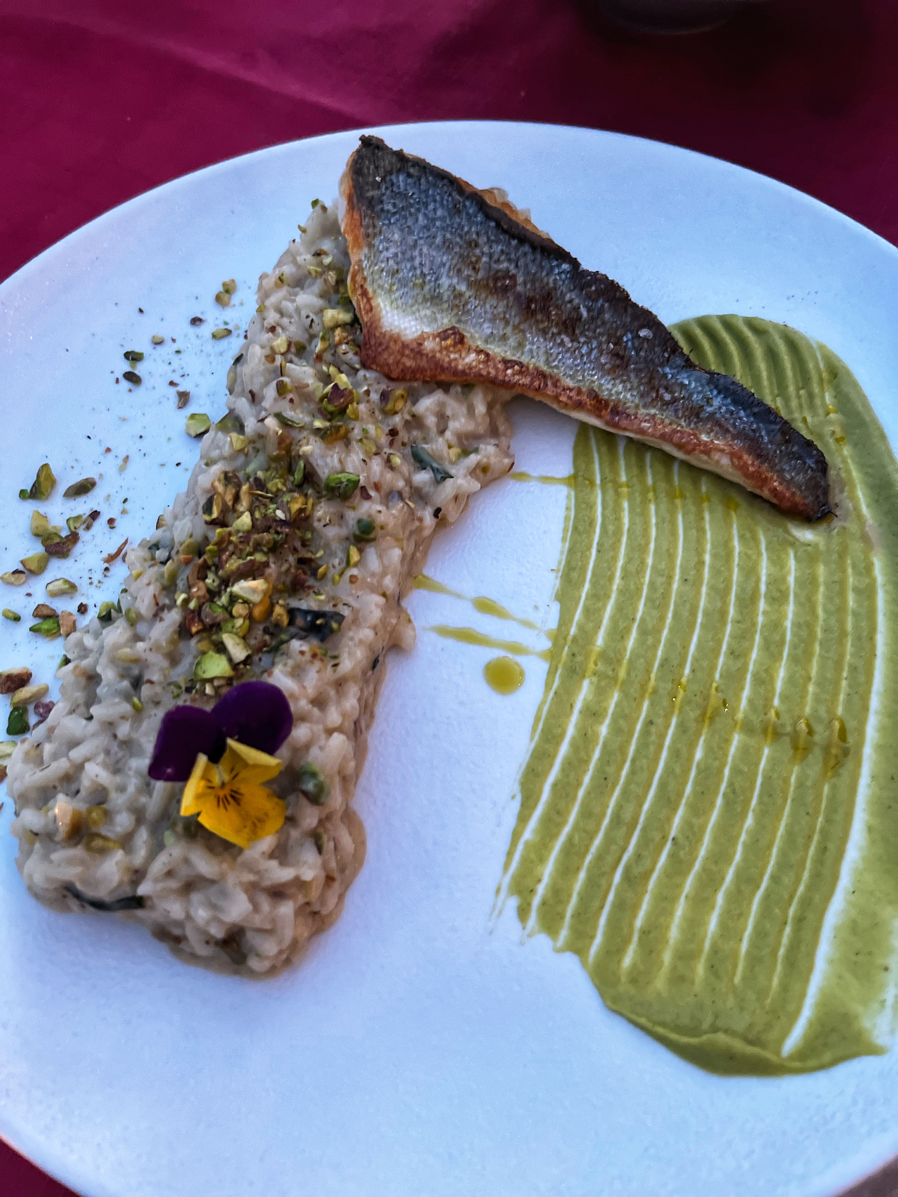 Me, pistachio risotto with sea bass. Her, wild mushroom with smoked bacon risotto with truffle oil.