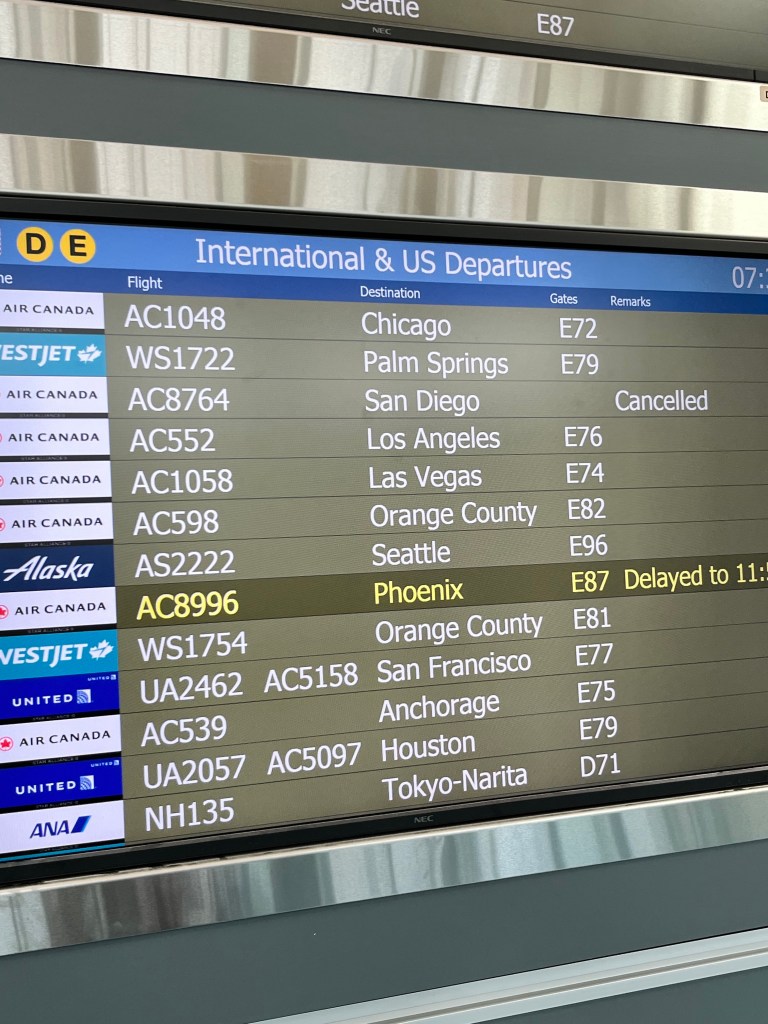 Our alarm went off early because our Uber was to be in front of our hotel at 8:30 for our 11:30 flight. I woke up to messages saying that our flight had been delayed two hours. So we rebooked our ride for later and went and had breakfast that’s when it hit us, we wouldn’t be making our connecting flight in Toronto. Fast forward an hour and a half, we were finally checked in and we were told that our luggage would meet us in San Diego. Sweet. We found a spot to grab a sandwich for the plane and that is where I found it, Fanta Limón. I grabbed two bottles, stuck them in our carry on and we were off to Toronto. Since we missed our connecting flight to Chicago, they automatically put us on another flight, but now we were headed to Vancouver. As we sat there we kept watching the screen push back our flight time..DELAYED. DELAYED, MOTHER FUCKING DELAYED. They blamed it on the galley and clean up crew, we would soon find out that all of the airlines were lacking all crew, including pilots and flight attendants. About an hour later we were finally making our way onto the aircraft and would be arriving in Vancouver at midnight. I searched high and low for a hotel to stay at but since we didn’t get our Covid tests the only option was The Fairmont in the international terminal and it was completely booked. So with that, we found ourselves a vending machine, bought some waters and cookies, found a row of open airport chairs and hunkered down for the night.