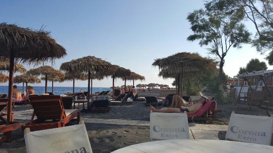 The beaches are all black sand (rock beaches) thanks to the volcanic lava and ash. Hot as hell is what is was, like it literally did just came out of a volcano.